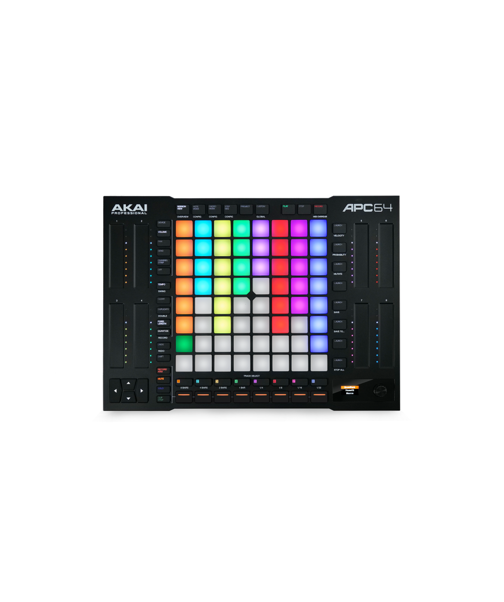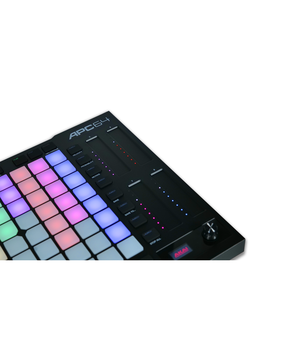 APC64 is the powerful next-generation Ableton Live controller that delivers new levels of control and performance. Featuring 64 RGB velocity-sensitive pads with poly-aftertouch, eight fully assignable touch strips, a revolutionary internal step sequencer, and more, APC64 is the future of Ableton Live hardware control.
