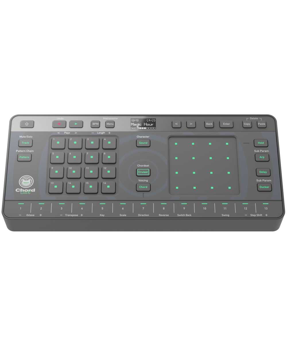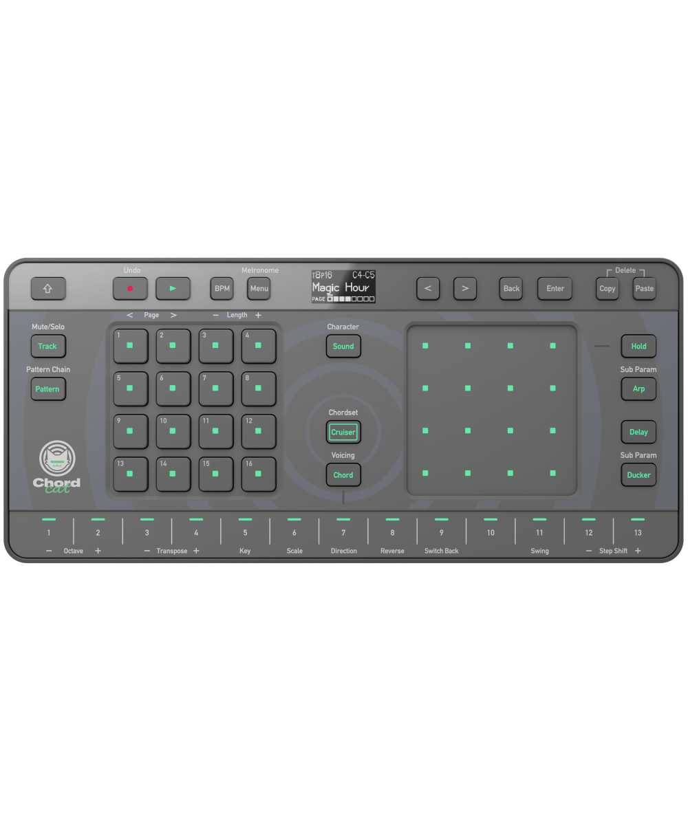 Put the groovebox in Chord Cruiser mode, and an exclusive algorithm selects and suggests multiple musically compatible chords from its database. You can listen to these chords and assign your favorite to a keyboard, triggering the next suggestion automatically.