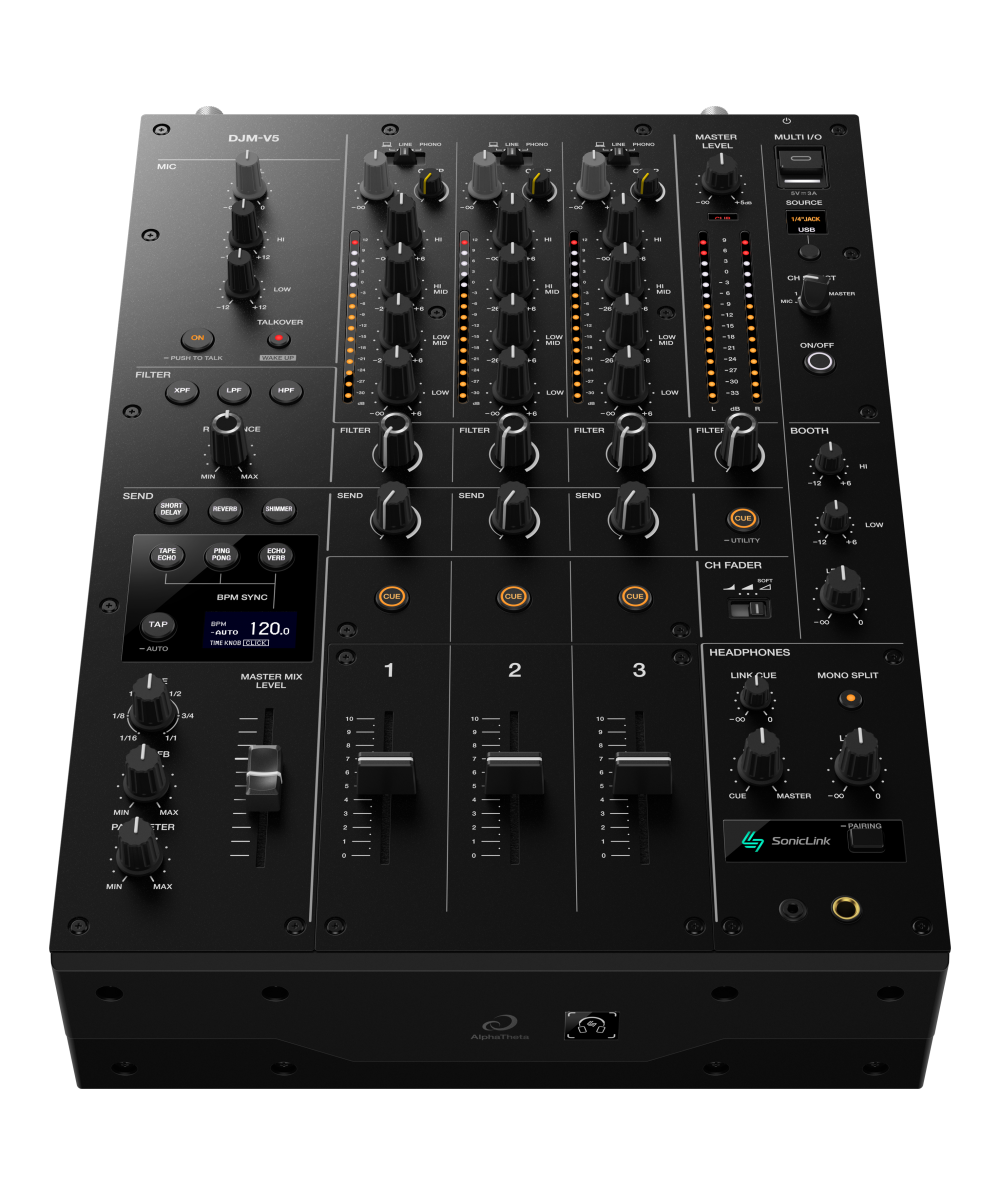The DJM-V5 takes the essence of the DJM-V10 and condenses it into a more compact 3-channel unit. While it’s physically smaller, it offers massive potential for uncompromising creative mixing, even in DJ booths with limited space. You can use a more advanced range of effects, including upgraded filters and Send FX, to express yourself when you play with the DJM-V5 – no matter what the setting. And the built-in SonicLink transmitter, which uses AlphaTheta’s unique ultra-low-latency wireless technology, enables you to perform with greater freedom. Simply pair it with HDJ-F10 headphones and you can monitor your music wirelessly with minimal latency, giving you new possibilities to enjoy a seamless and flexible mixing environment.