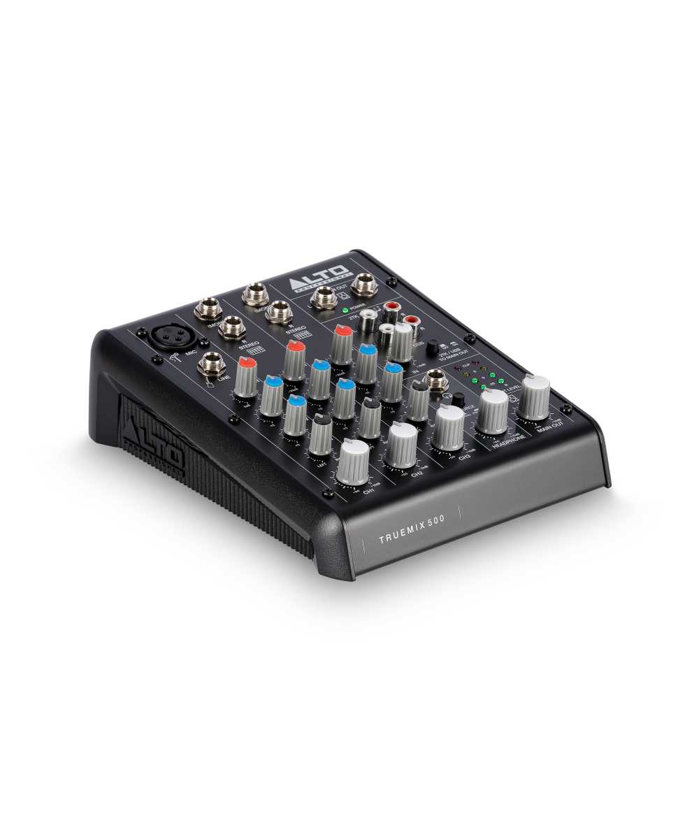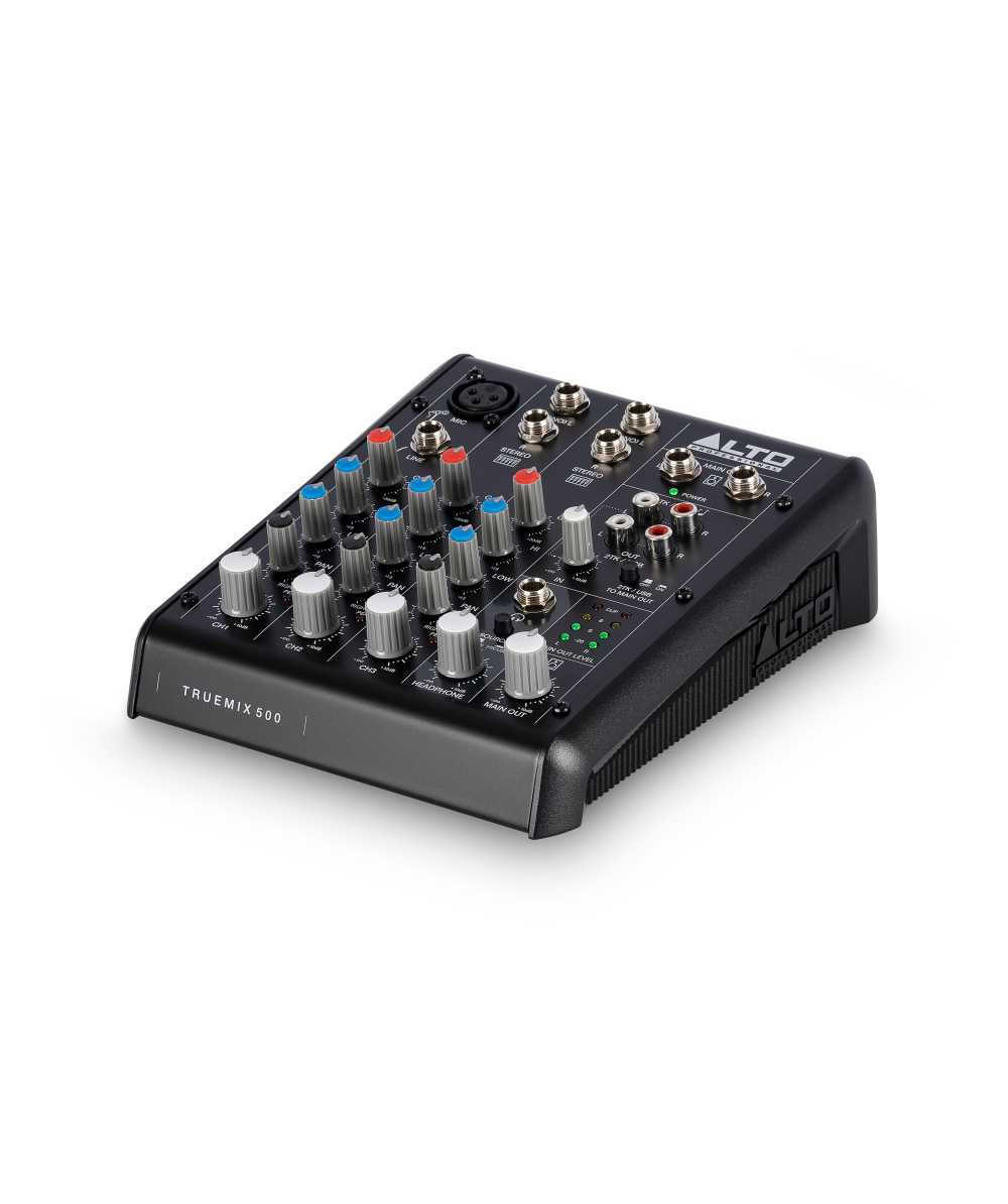 The Alto Professional TrueMix 500 is a portable mixer with a built-in stereo USB audio interface that delivers all the essential features you need for home recording, livestreaming, podcasting, or performing. There are five analog inputs with high-headroom circuitry for minimal noise and clipping in your signal. The Mic Input Channel offers an XLR input that’s great for connecting a microphone. This channel also has a balanced ¼” line input for connecting instruments and other line-level signals. There are also two Stereo Input Channels, each with dual balanced ¼” TRS inputs. These inputs are perfect for your line level audio sources. All channels feature a two-band EQ with color coded knobs that make it easy to dial in your perfect sound when operating in low-light situations. Connecting the TrueMix 500 to your computer is also lightning fast, with plug and play connectivity on Windows and macOS. The TrueMix 500 is your perfect companion for no-nonsense audio mixing and recording on the go.