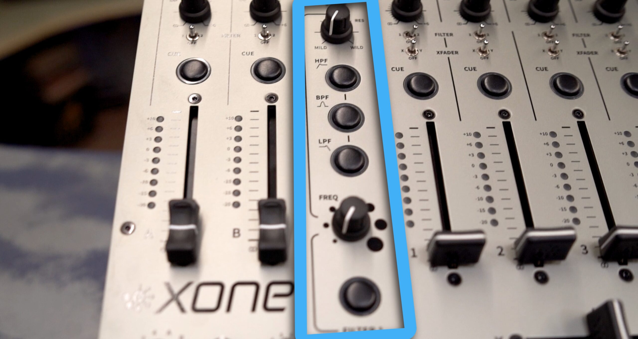 XONE mixers have an independent filter system or two of them, in the case of the XONE:96, which is assigned per channel. Unlike single-knob filters, the zero position is all the way to the left, not 12 o’clock. If you flip a Filter toggle switch to Filter 1 or Filter 2, it allows you to select which of the filters you’re using, and also gives you a way to apply the same filter to multiple channels.