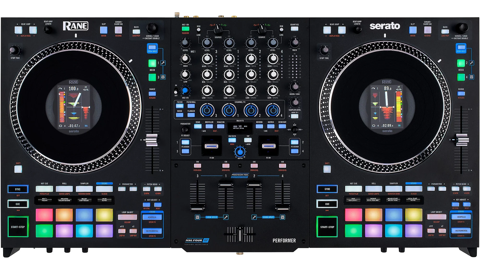 The RANE Performer brings together the best of their existing lineup, and perfectly mashes it together into a new flagship. You could think of it as a RANE One with four channels; or probably more accurately, a RANE Four with motorized platters.