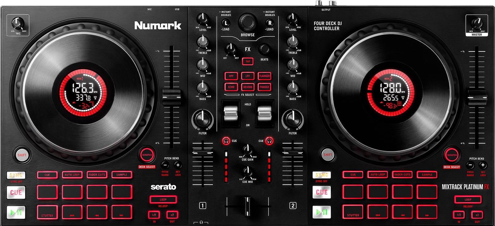 The big, capacitive-touch 6′′ jog wheels on the Numark Mixtrack Platinum FX house lovely digital displays, which give basic BPM and track position feedback. This is the only controller in this price bracket to offer this feature.