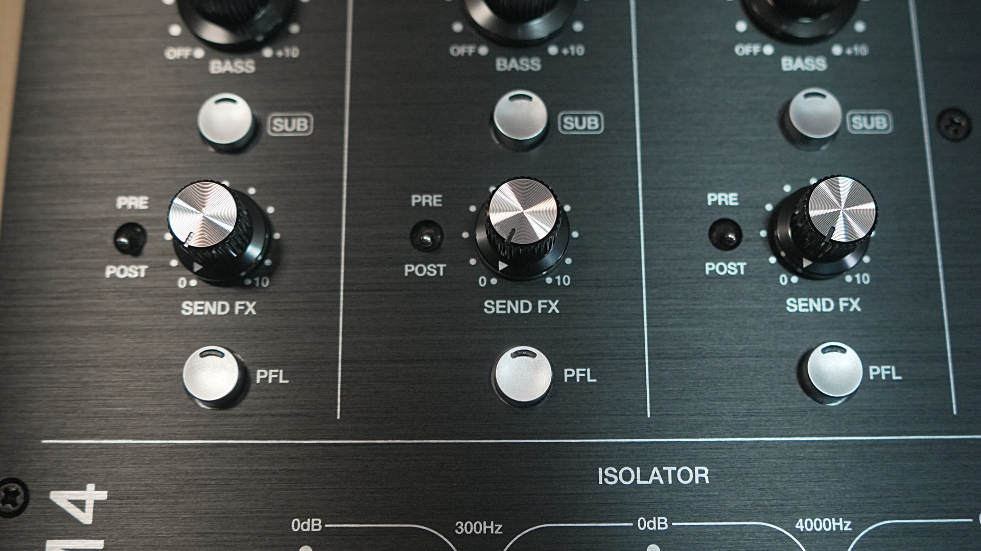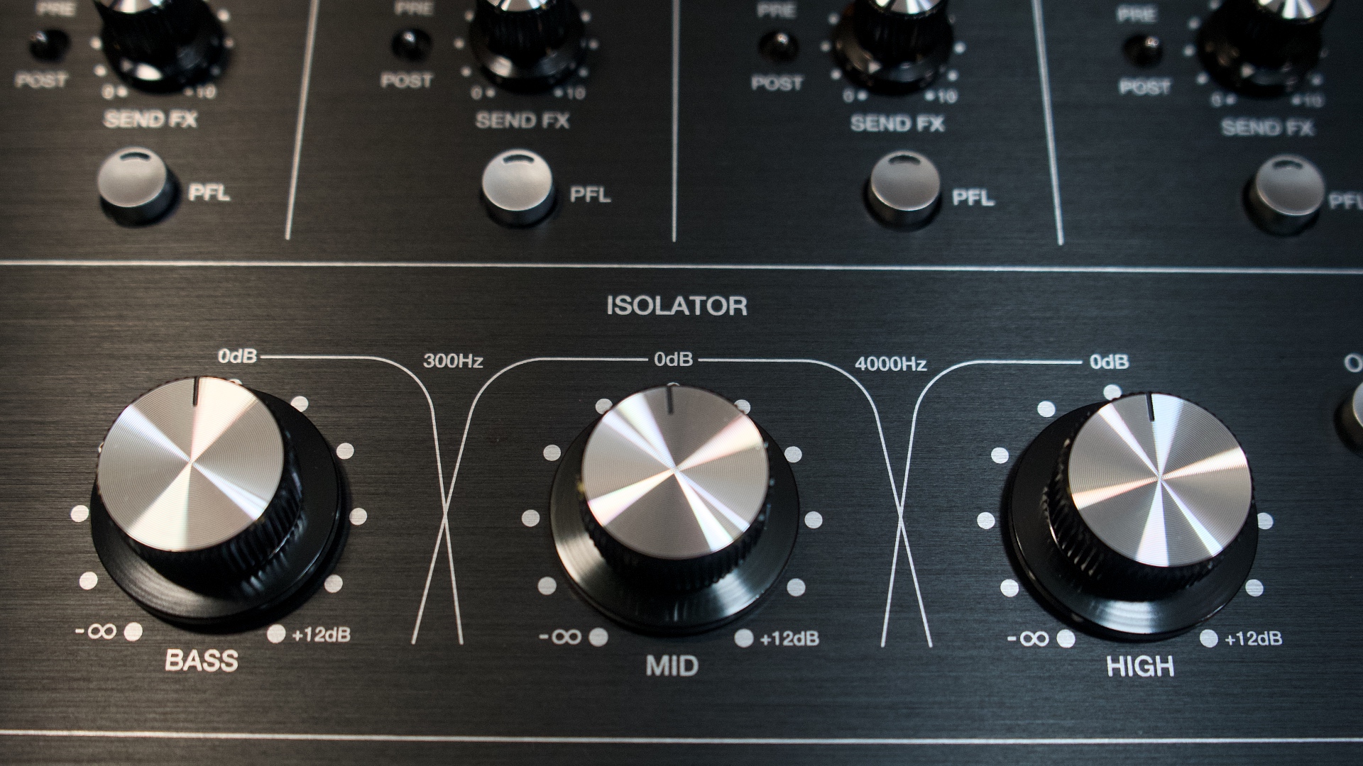 Lower on the mixer (above the channel encoders) you’ll find a 3-band master isolator (4th order 24dB/oct slope). Use this for dramatically shaping the sound to fit the environment you’re playing in. Or, for adding dramatic builds or drops to the entire mix output.