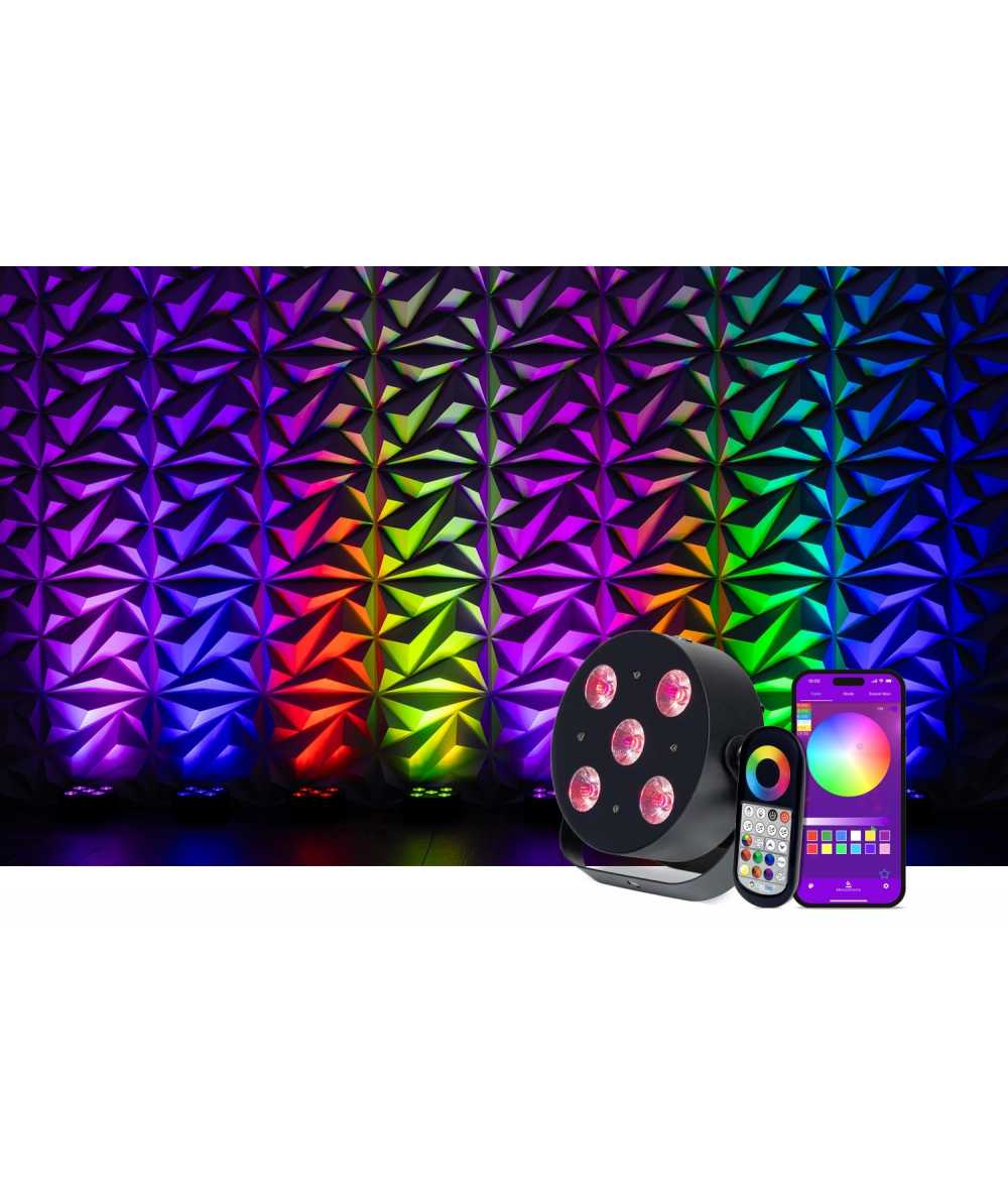 The MobilePar HEX 5 can be controlled via wireless DMX, an included RF remote, or an iOS app.