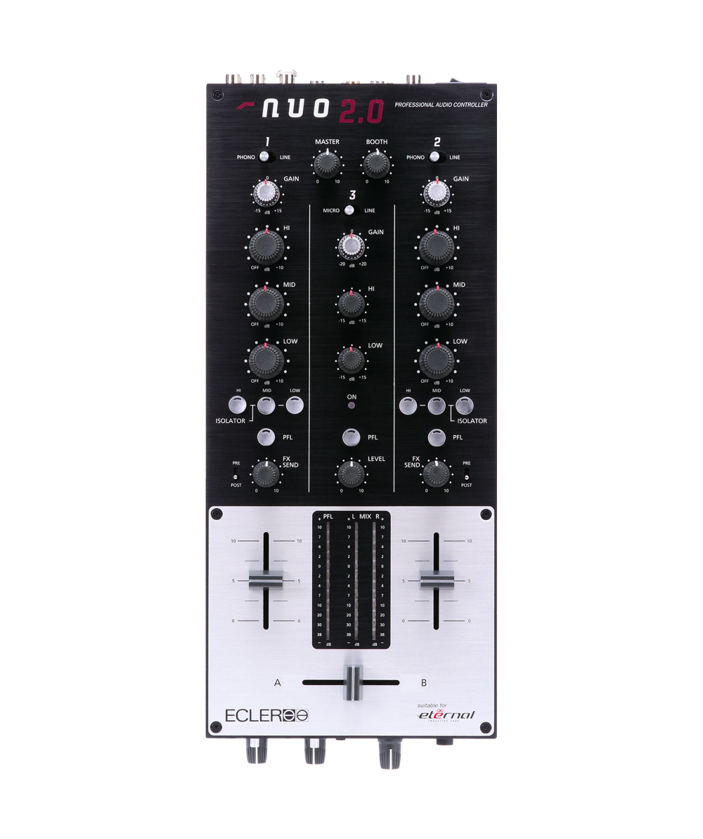 Whether you play house, techno or hip hop, perform smoothly or as a scratch DJ, the NUO 2.0 will please all your needs thanks to its versatility and plenty of features, such as the precise and ergonomic full cut EQ, FX Send control per channel in pre or post fader mode, faders curve adjustments and suitability for the awarded magnetic ETERNAL crossfader for the professional scratch DJ. Its superb sound quality and robust format, plus balanced XLR Master output and Booth output for monitoring make it also a perfect mixer for small installations.