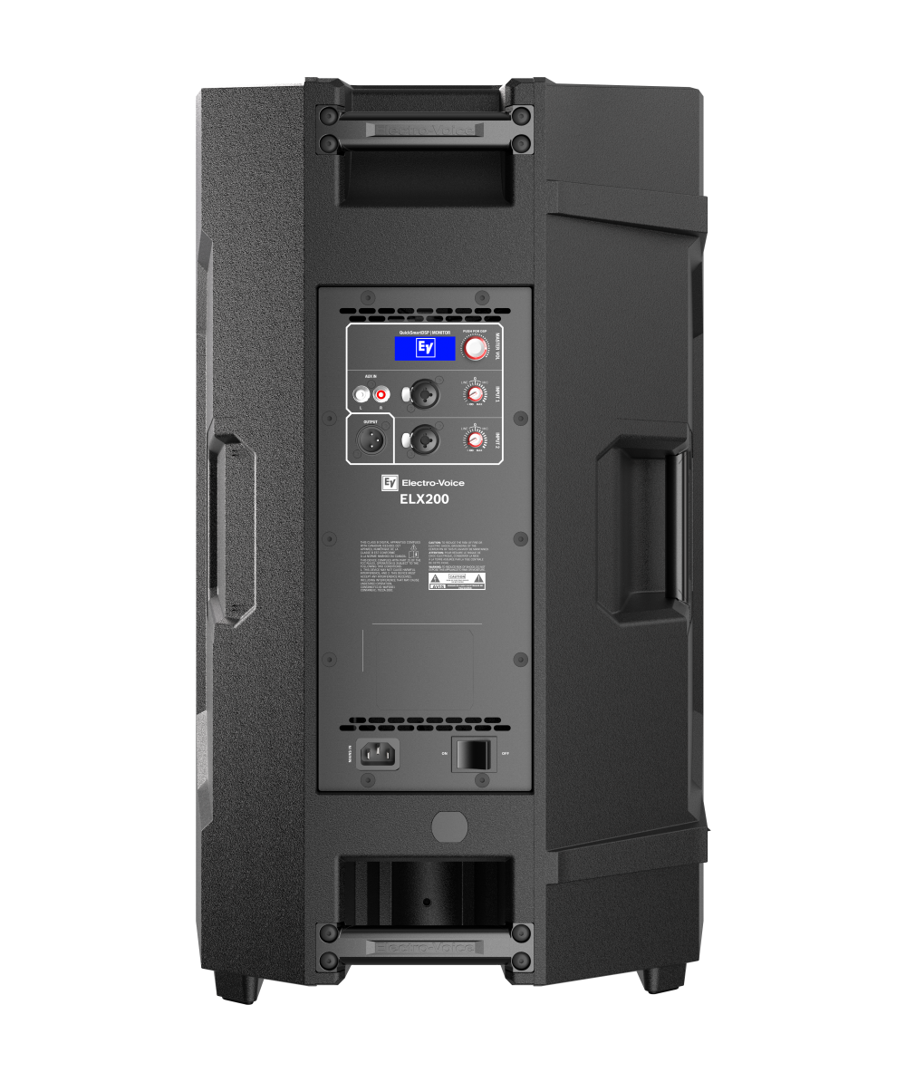 ELX200-15P features high-efficiency Class-D power amplifiers (up to 1200 W) with integrated QuickSmartDSP, and delivers up to 132 dB SPL utilizing transducers designed and engineered by EV (15-inch EVS-15M woofer coupled with a DH-1L 1-inch titanium compression driver). Powered full-range models allow easy setup via four presets (Music, Live, Speech, Club), sub/top system-match crossovers, three-band EQ, five user-programmable presets (Store and Recall settings), visual monitoring of limiter status, input level control and meters, and master volume control to ensure optimal gain structure.