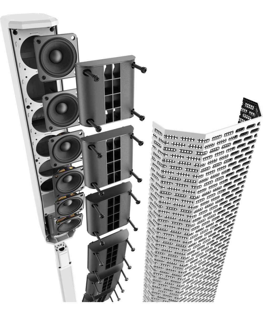 A 10” subwoofer is housed in a 15 mm wood enclosure with a high-efficiency laminar-flow vent design, for enhanced rigidity and acoustical performance. The array and sub are connected via a two-piece symmetrical aluminum pole with internal wiring and magnetically assisted latching. An advanced Class-D amplifier provides up to 1000 W of power: 500 W to the subwoofer and 500 W to the column array. The speakers are protected by a black powder-coated 18-gauge steel grille. Combined, these elements generate a genuinely impressive performance-to-size ratio in an elegant form factor that looks as good as it sounds.