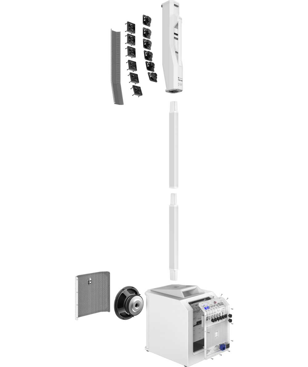 The system includes a speaker array, a two-piece pole connector, an array and pole backpack carry case, and a powered subwoofer – all made to pack up and assemble quickly, look great on stage, and withstand real-world wear and tear.