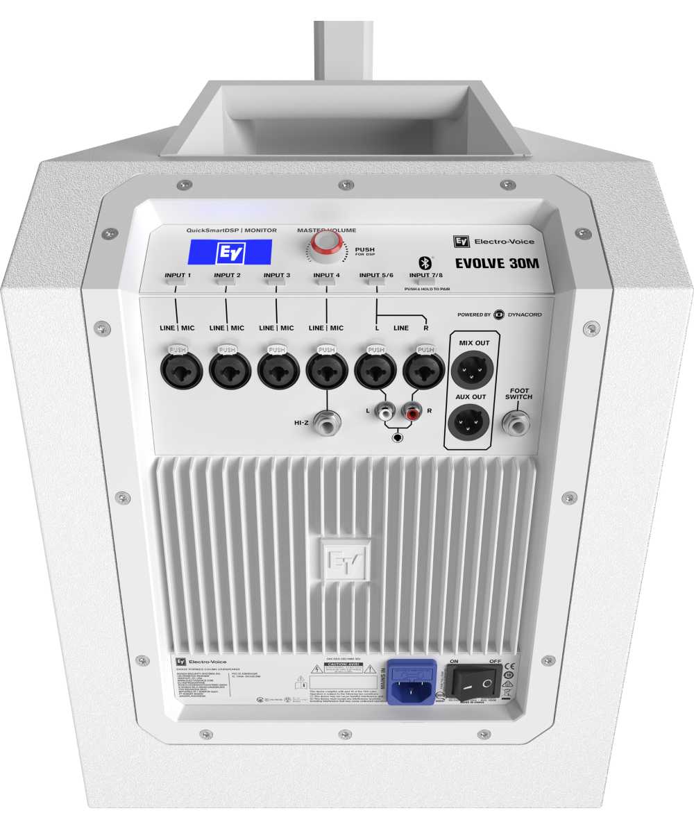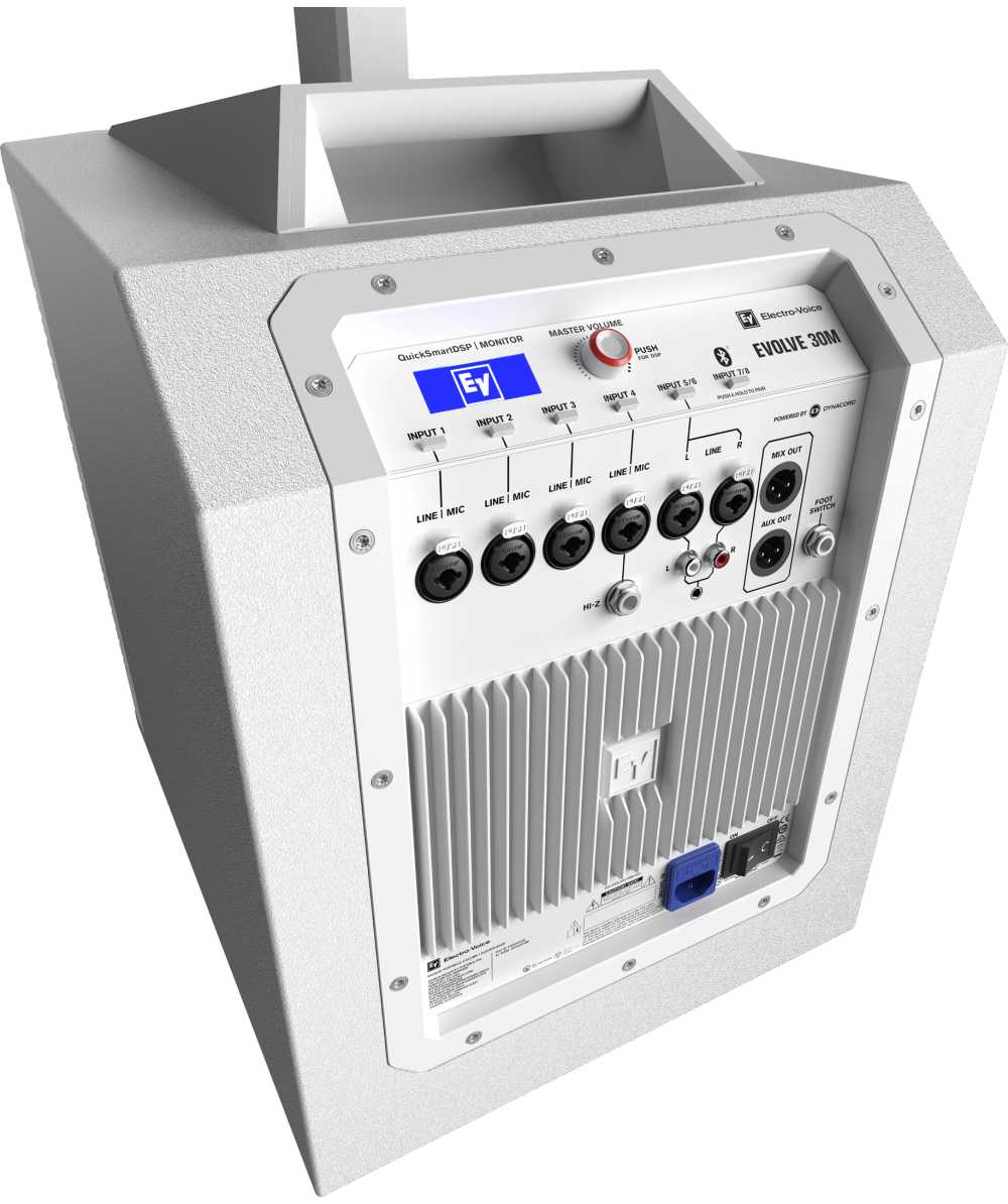 The EVOLVE 30M is designed to deliver a significant step up in all-around performance for a column system in its size/price category. It includes an eight-channel digital mixer, studio-quality onboard effects, and remote control of all audio, effects and mix functions via the next-generation Electro-Voice QuickSmart Mobile application (available via the Apple Store and on Google Play).