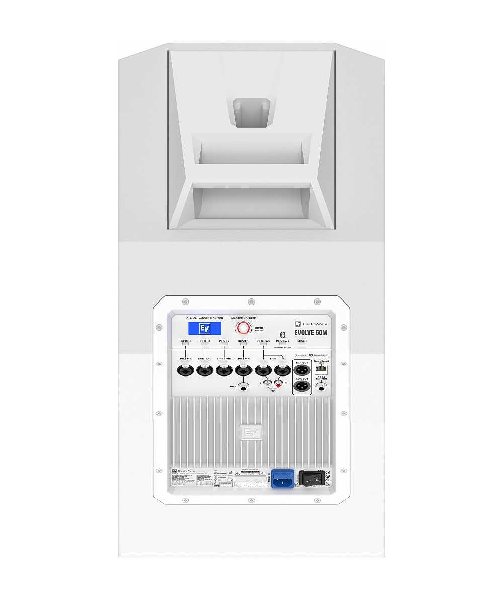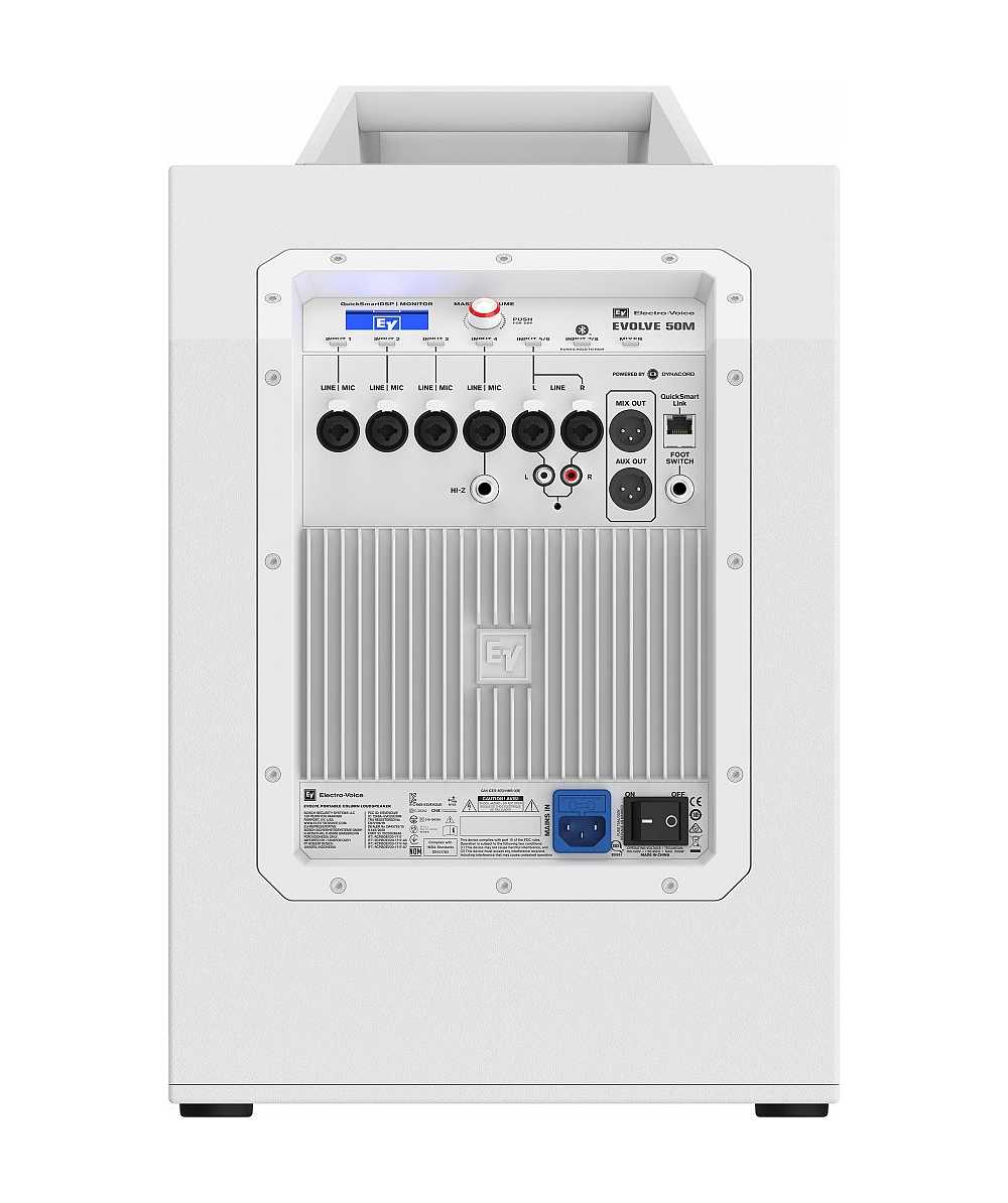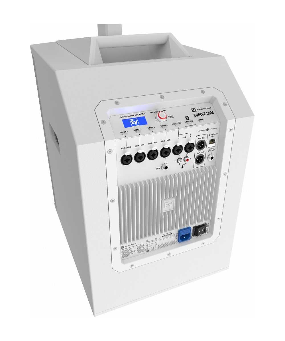 The EVOLVE 50M’s control panel features ElectroVoice’s powerful QuickSmart DSP, which allows the navigation and adjustment of all audio, effects and mix functions via an LCD with single-knob control or via the QuickSmart Mobile app, as well as multiple options for signal routing and inputs. Functions include four presets (Music, Live, Speech, Club), three-band system EQ (low, mid, high), seven-band graphic EQ (in Mixer mode), five user-programmable presets (Store and Recall settings), phantom power, visual monitoring of limiter status, input level control and meters, and a master volume control to optimize gain structure.