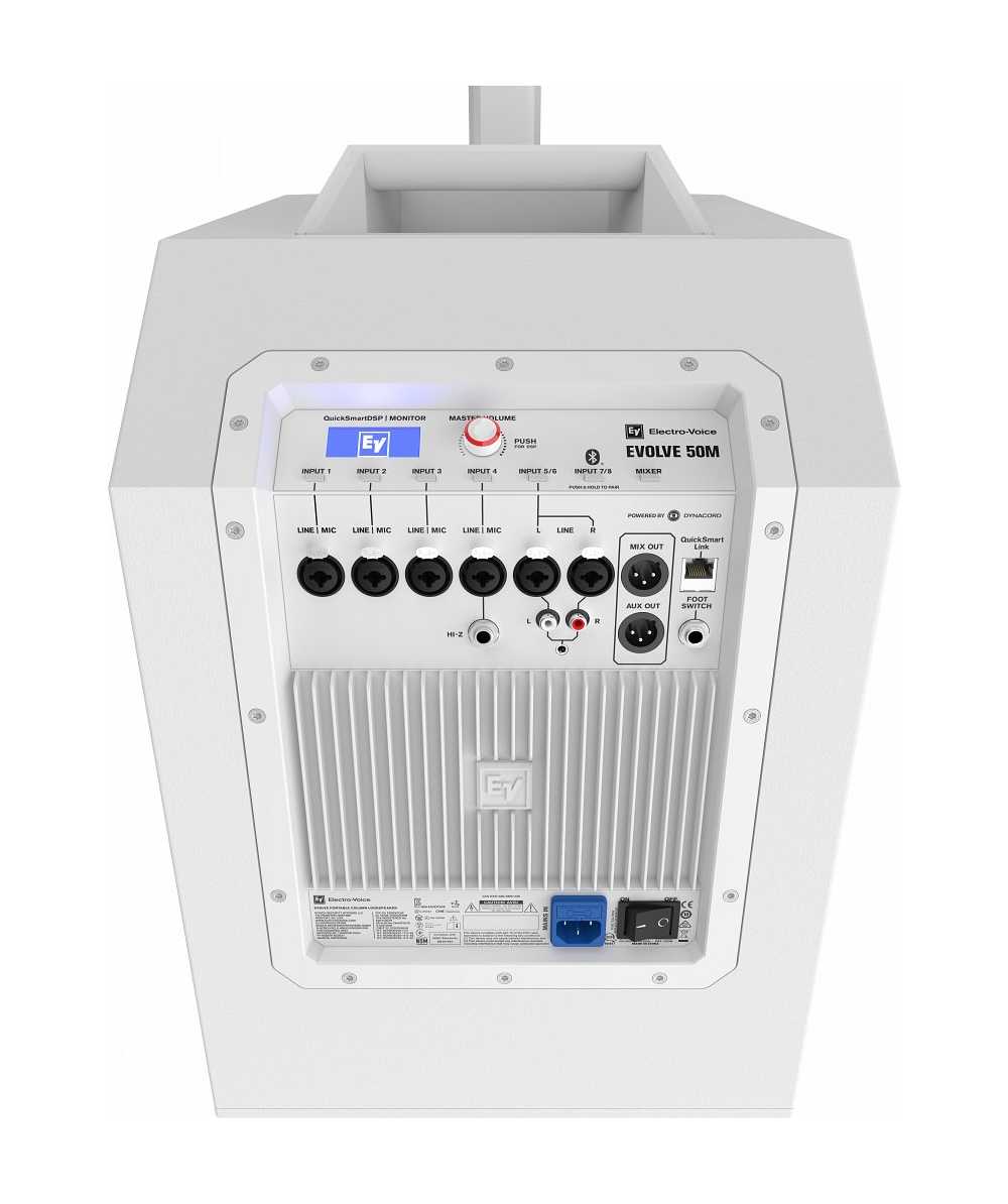 Equipped with the most comprehensive and user friendly feature set of any column system on the market today, the EVOLVE 50M’s “M” designation refers to its integrated fully featured, fully configurable eight channel digital mixer. Developed in collaboration with the world-class audio electronics engineering team at Electro-Voice’s sibling brand Dynacord, the mixer has multiple inputs (4x XLR/TRS combo mic/line inputs, 1x XLR/TRS combo stereo line input, 1x RCA, 1x 3.5 mm stereo, 1x Hi-Z instrument input) with professional grade preamps and mix functions. High-resolution, low latency Bluetooth® streaming ensures excellent results for music playback or accompaniment. Independent channel aux sends and a foot switch input are also included, and a range of effects (30 presets, including chorus, delay, flange and reverb, via two FX channels) add a myriad of options for musicians to fine-tune their tone. All of the above help to reduce load-in/out and setup/teardown time - and on-stage clutter - by minimizing the need for external equipment such as a mixer and effects pedals.