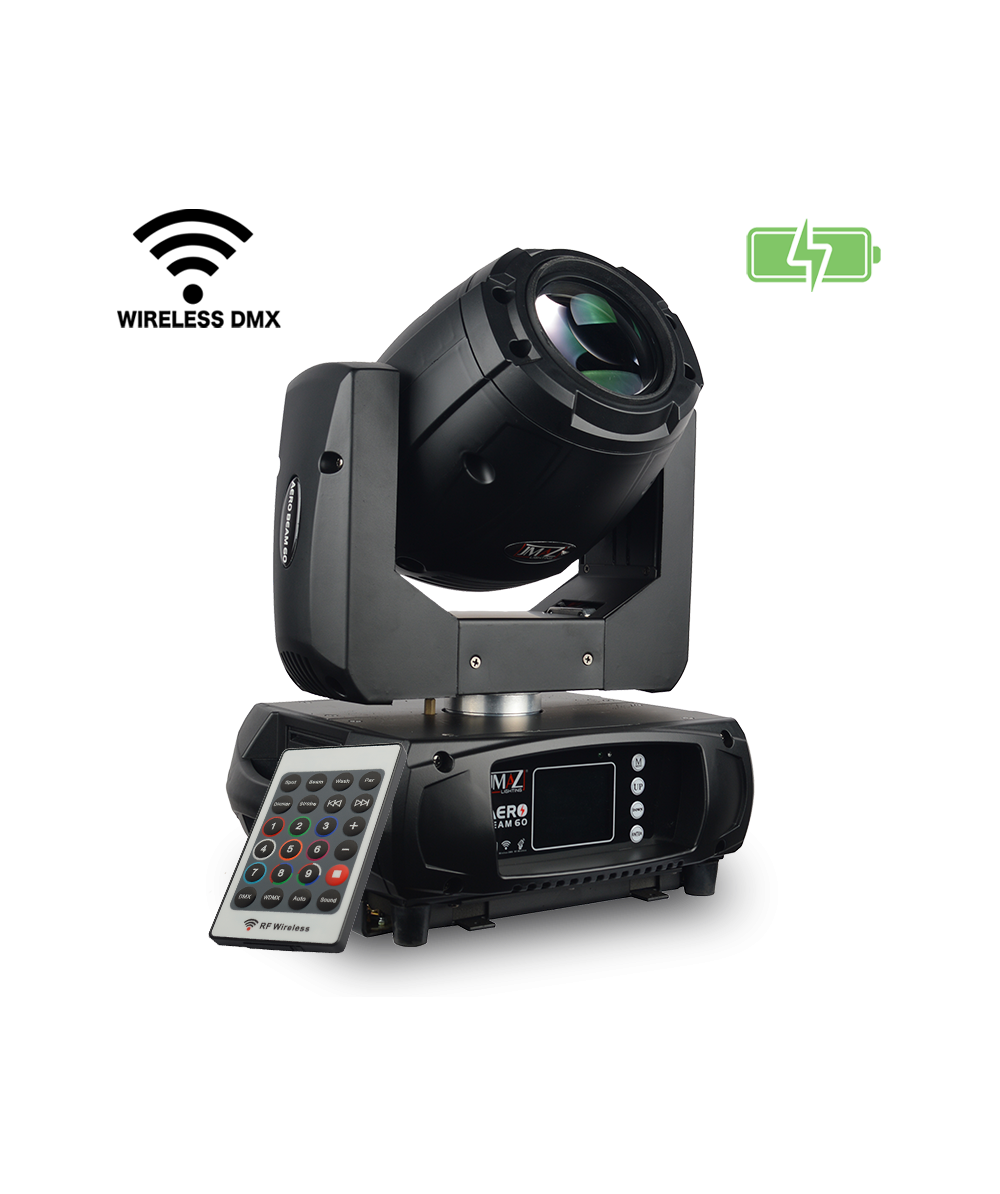 The JMAZ AERO BEAM 60 Battery Powered LED Moving Head features a 60W 7500K white LED with a 2° beam angle and electronic focus. Offering 8 hours of battery life (10 in saving mode) and a 5.5-hour charge time, it includes 14 colors, 17 static gobos, and an 8-facet prism. Controlled via DMX512, wireless DMX, or RF remote, with nine auto/sound programs. Comes with an RF remote, Omega bracket, powerCON cable, and safety accessories.