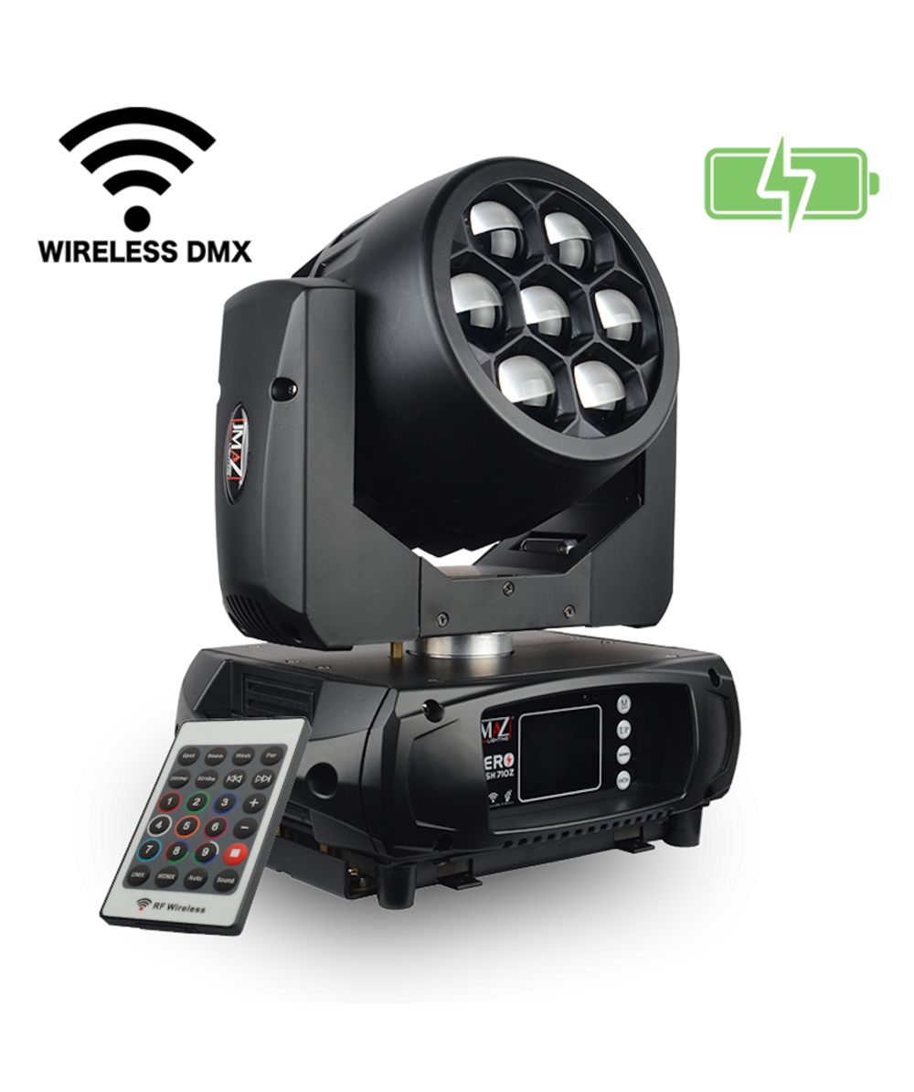 The JMAZ AERO WASH 710Z Battery Powered RGBW LED Wash Moving Head features 70W RGBW LEDs with a 6°-60° electronic zoom and color temperature range of 2700K-8000K. Offering up to 8 hours of battery life (10 in saving mode) and 9 auto/sound programs, it supports DMX512, wireless DMX, and RF remote control. Includes an RF remote, Omega bracket, powerCON cable, and safety accessories, ideal for versatile and dynamic lighting setups.