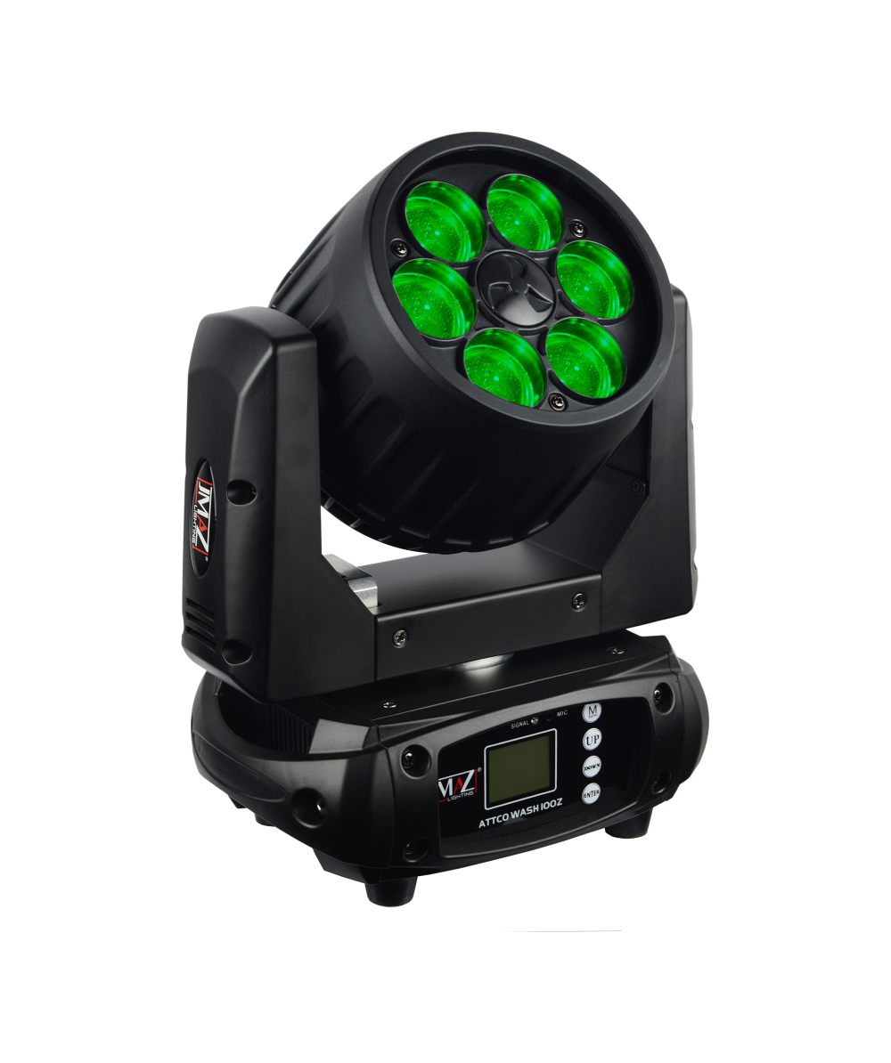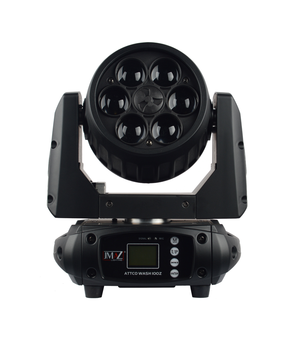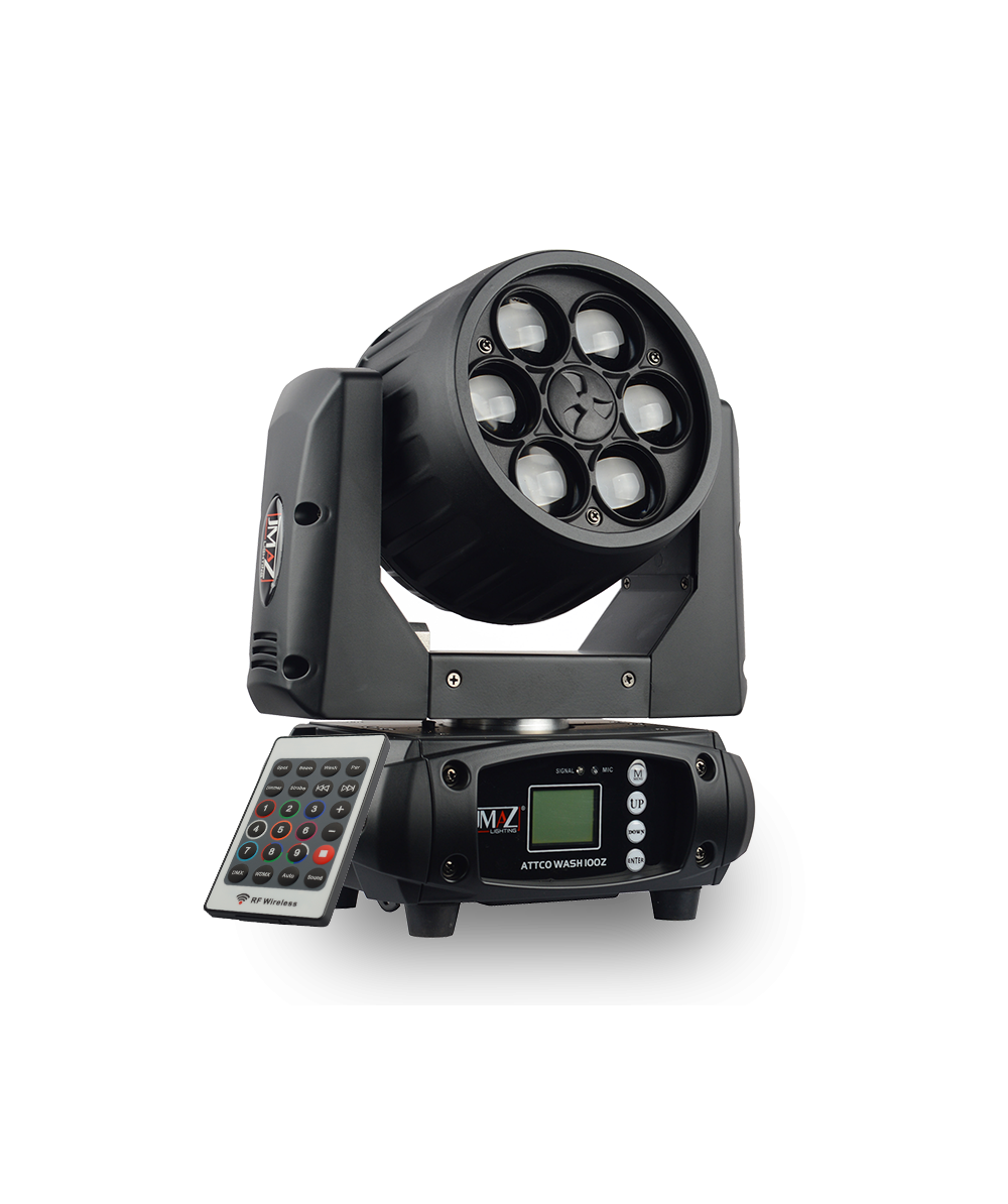 The JMAZ ATTCO WASH 100Z is a 90W RGBW LED Moving Head with a 6° to 60° electronic zoom and built-in color effects. Featuring 6 x 15W RGBW LEDs, it offers 9 auto/sound programs and supports DMX512 and RF remote control for versatile lighting control. Ideal for dynamic wash effects, it includes an RF remote, Omega bracket, powerCON cable, DMX cable, and safety accessories for easy setup.