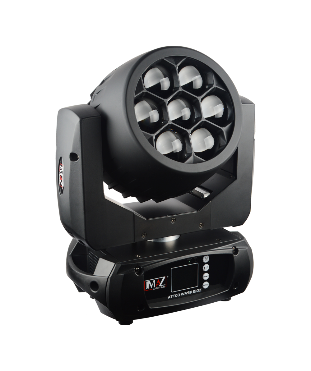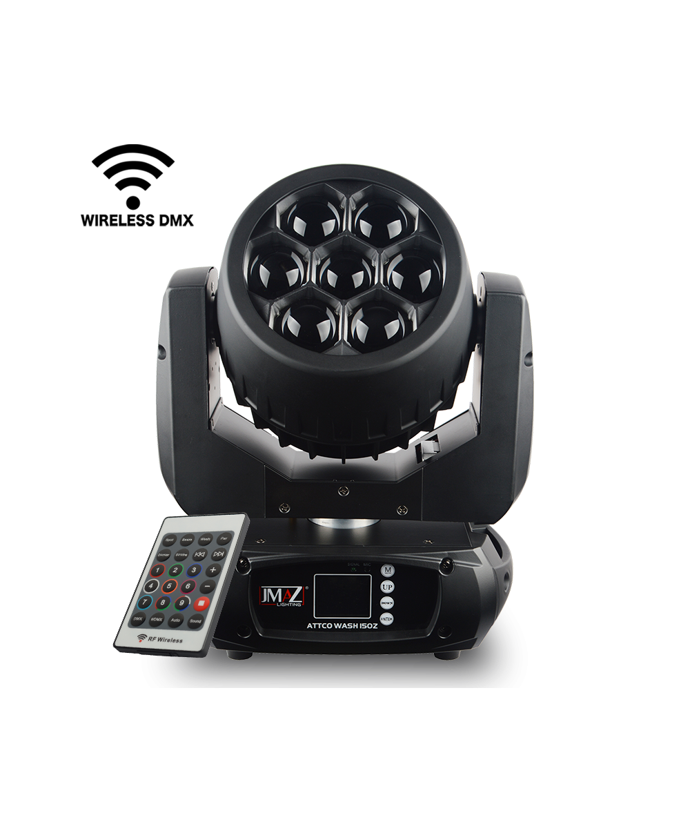 The JMAZ ATTCO WASH 150Z is a powerful 210W RGBW LED Moving Head with a 6° to 60° electronic zoom and adjustable color temperature range of 2800K to 8000K. Featuring 7 x 30W RGBW LEDs, built-in color effects, and 9 auto/sound programs, it supports DMX512, wireless DMX, and RF remote control. Ideal for vibrant wash effects, it includes an RF remote, Omega bracket, powerCON cable, DMX cable, and safety accessories for versatile applications.