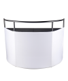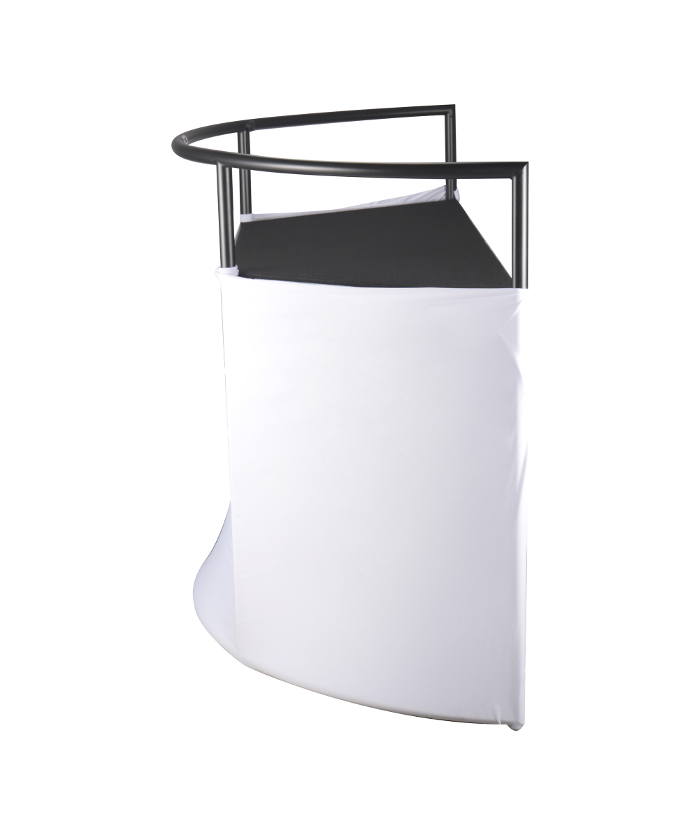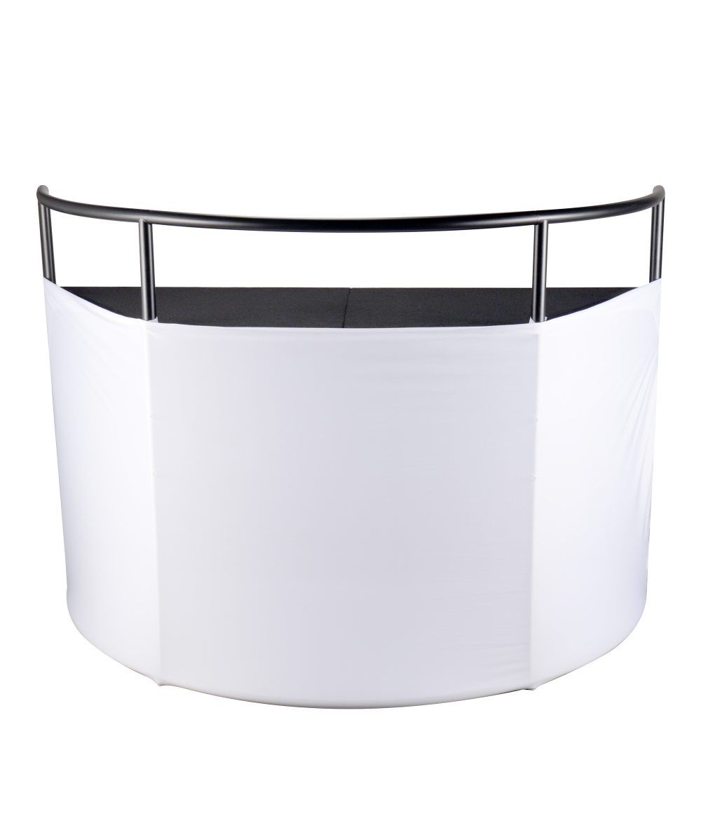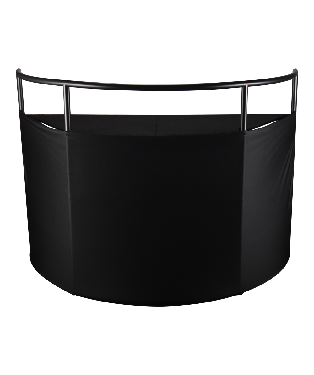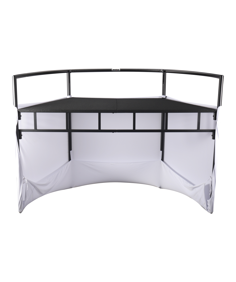 The JMAZ Command Booth Event Facade with Black and White Scrims is a versatile solution for DJs and event professionals. Featuring adjustable, washable scrims and detachable sections, it includes a sturdy steel pipe construction and a command table for controllers or gear. The table measures 34″ x 24″ at the front, 65″ x 24″ at the back, and is 35″ high. Comes with a carrying bag, black and white scrims, assembly accessories, and a manual for easy setup.