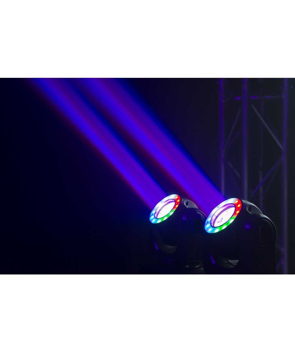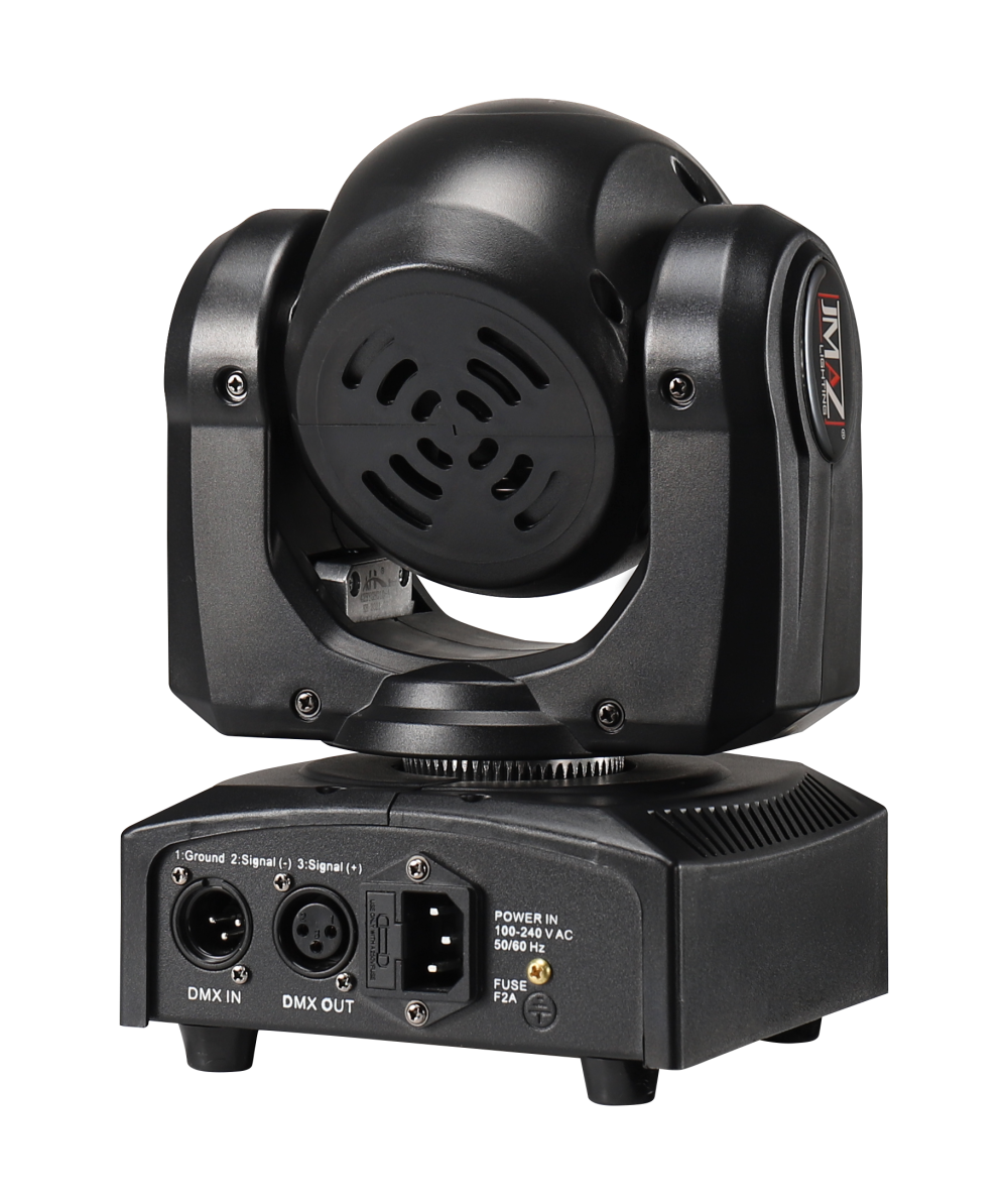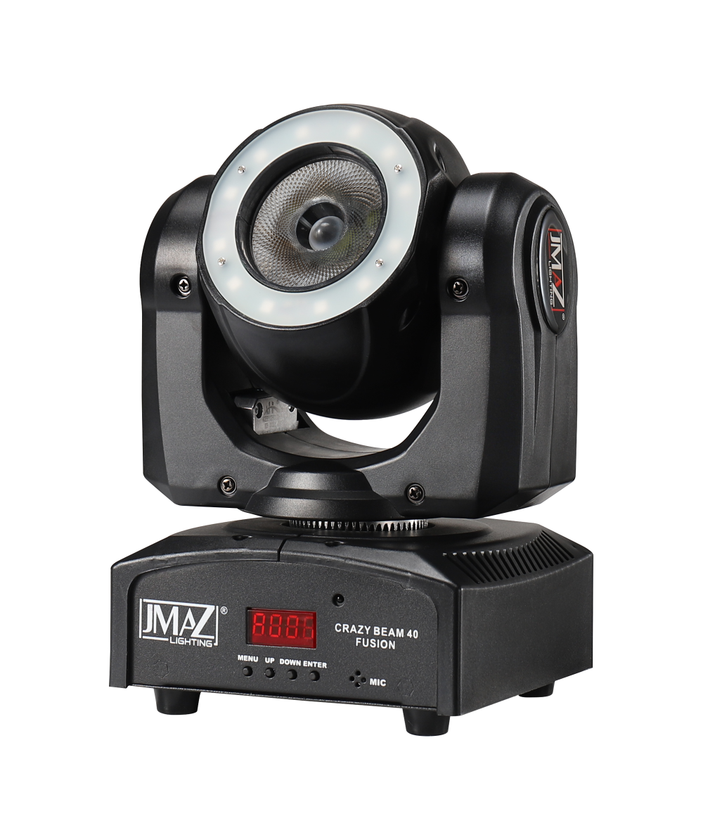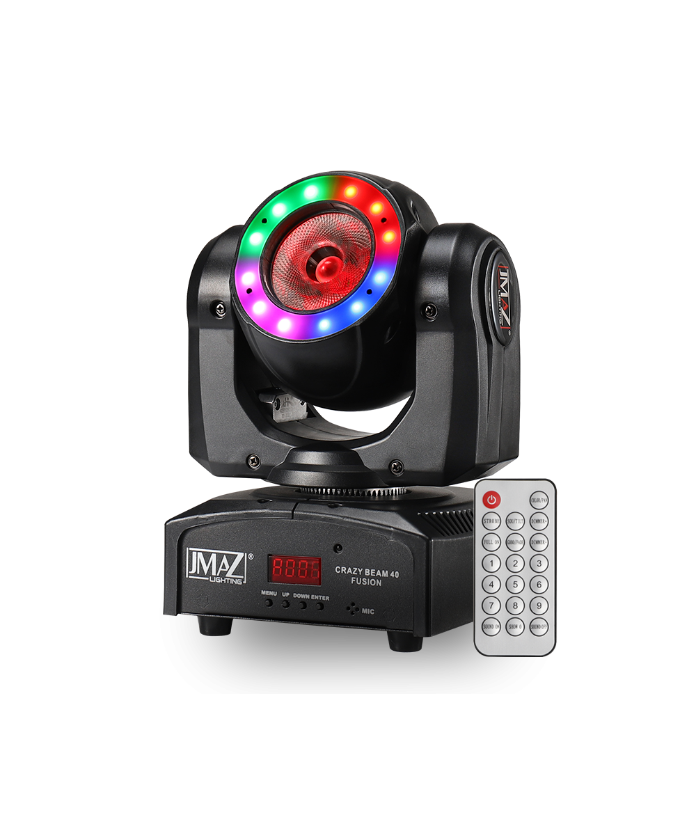 The JMAZ CRAZY BEAM 40 FUSION is a 60W RGBW LED Moving Head with a unique ring effect featuring 12 x 0.5W RGB SMD LEDs. It has an 8° beam angle and 4 built-in auto/sound programs, offering dynamic lighting effects. Compatible with DMX512 and RF remote control, it includes an RF remote, clamp bracket, A/C cable, and DMX cable for versatile and easy setup. Perfect for eye-catching lighting displays.