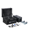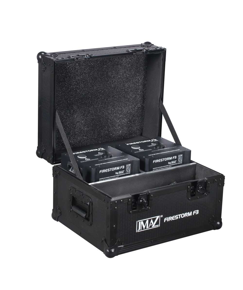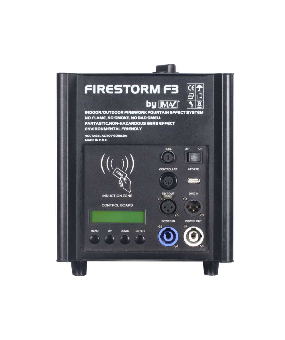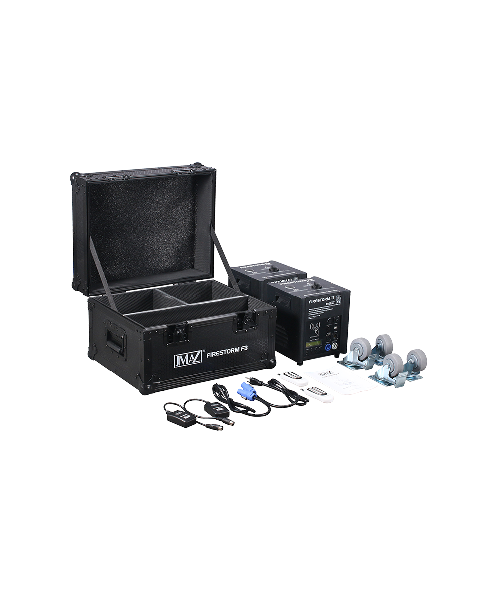 The JMAZ Firestorm F3 500W Cold Spark Machine 2PK with Road Case and Granules delivers impressive spark effects adjustable from 3′ to 13′, with durations of 5 to 30 seconds. Featuring quick warm-up under 8 minutes, three height settings (low, medium, high), and tip-over safety protection, it ensures efficient and safe operation. The package includes two units, a road case with locking casters, two granule packs, IR remotes, powerCON cables, and RF receivers.