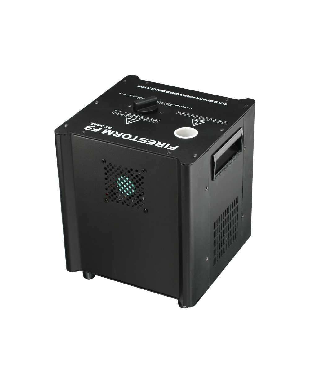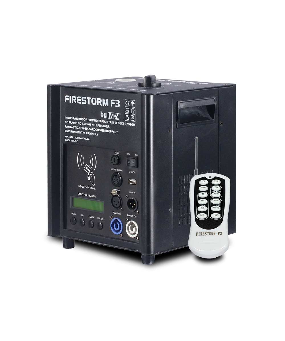 The JMAZ Firestorm F3 Cold Spark Machine offers adjustable spark heights from 3′ to 13′ with selectable durations of 5, 10, 20, and 30 seconds. Featuring a fast warm-up time under 8 minutes, tip-over safety, and three spark height options (low, medium, high), it ensures versatile and safe operation. Requires JMAZ Authentic Granules (SKU: JZ4005) and includes RF Remote, powerCON cable, and receiver. DMX512 compatible. Ideal for dynamic event effects. *Granules not included.