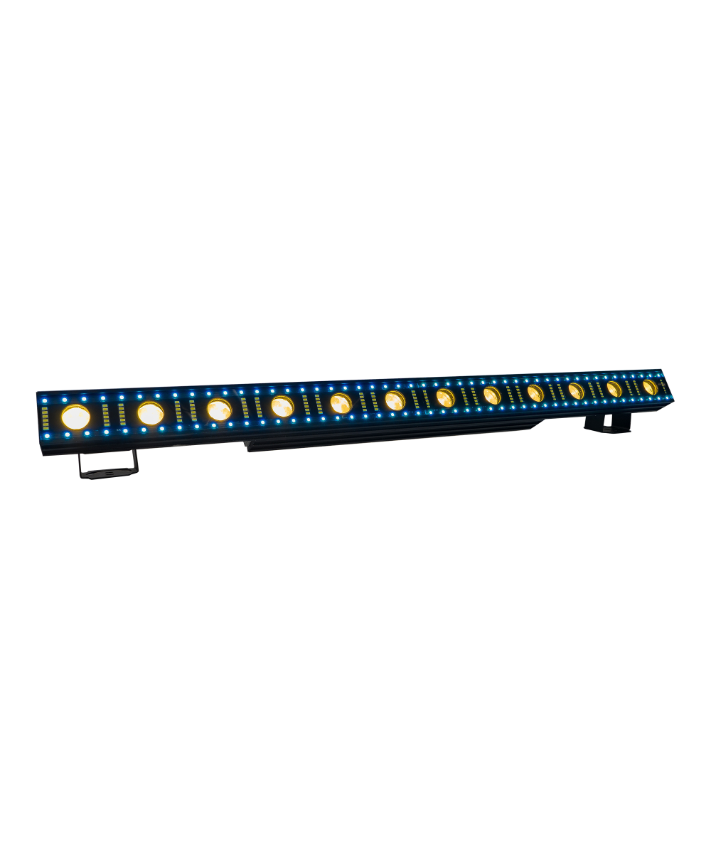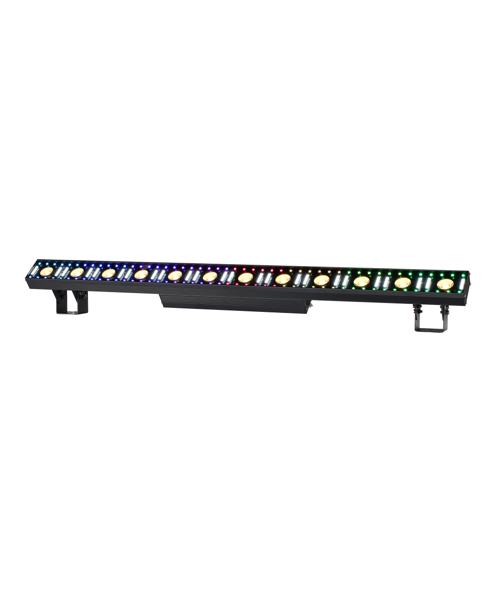 The JMAZ PIXL FX BAR 5050 is a 180W RGB/CWW LED effect bar featuring 60W warm white LED beams, 48W RGB SMD LEDs, and 72W cool white inner SMD LEDs. With a narrow 3° beam angle, it offers 10 built-in auto sound programs and 8 sound programs. DMX512 compatible with powerCON in/out, it includes a powerCON cable, stand mount, and DMX cable, making it ideal for dynamic lighting effects. No remote included.