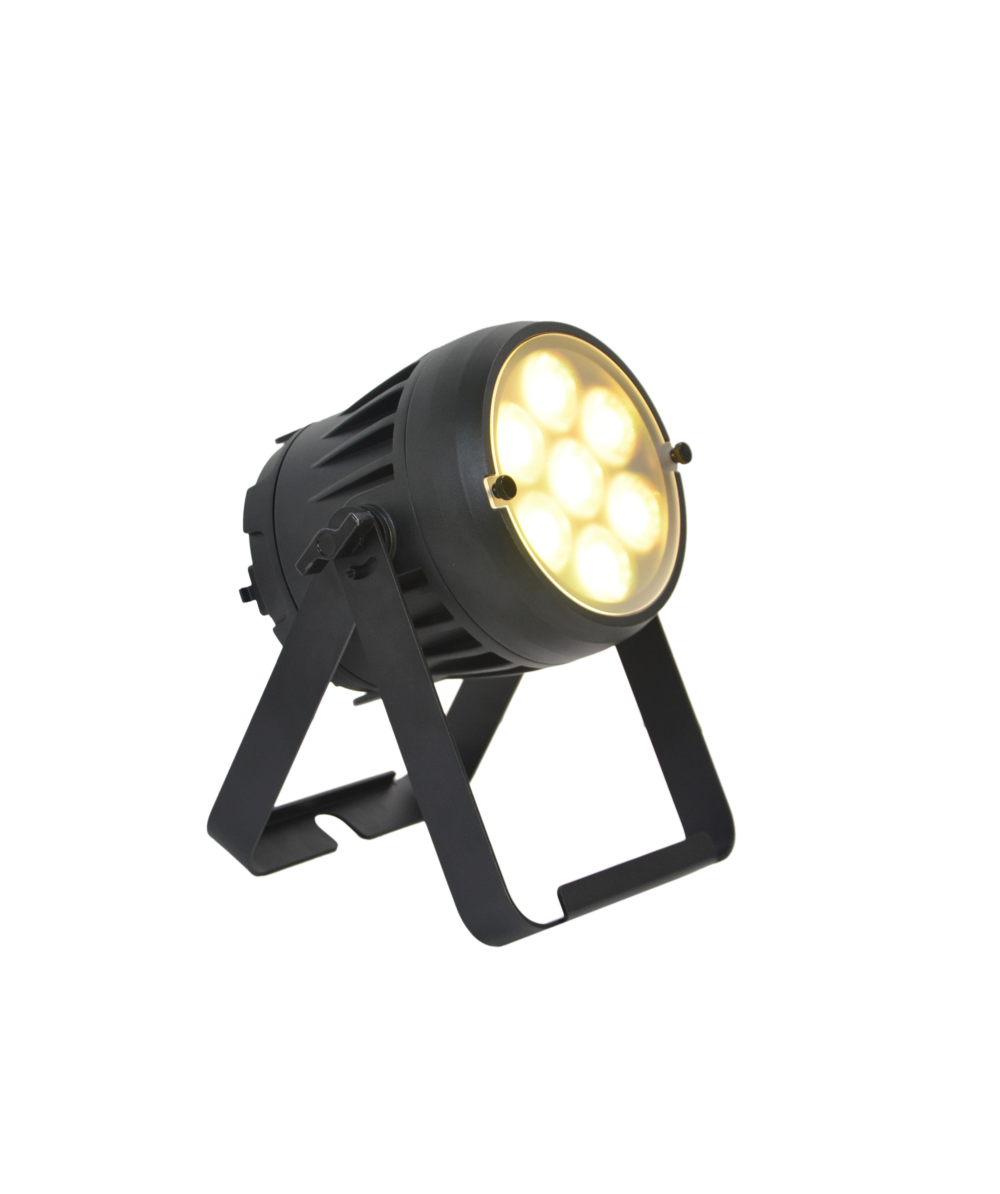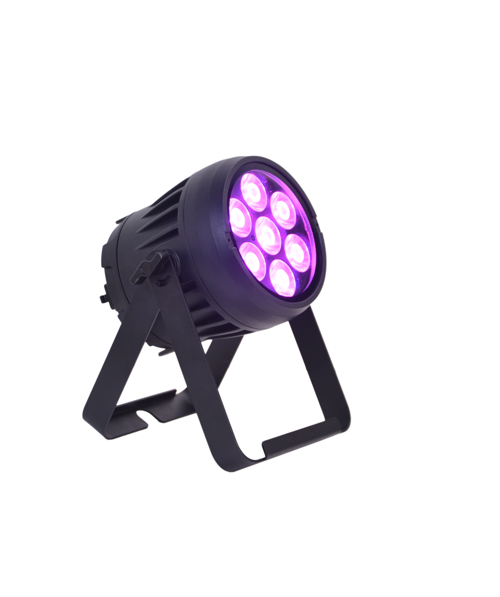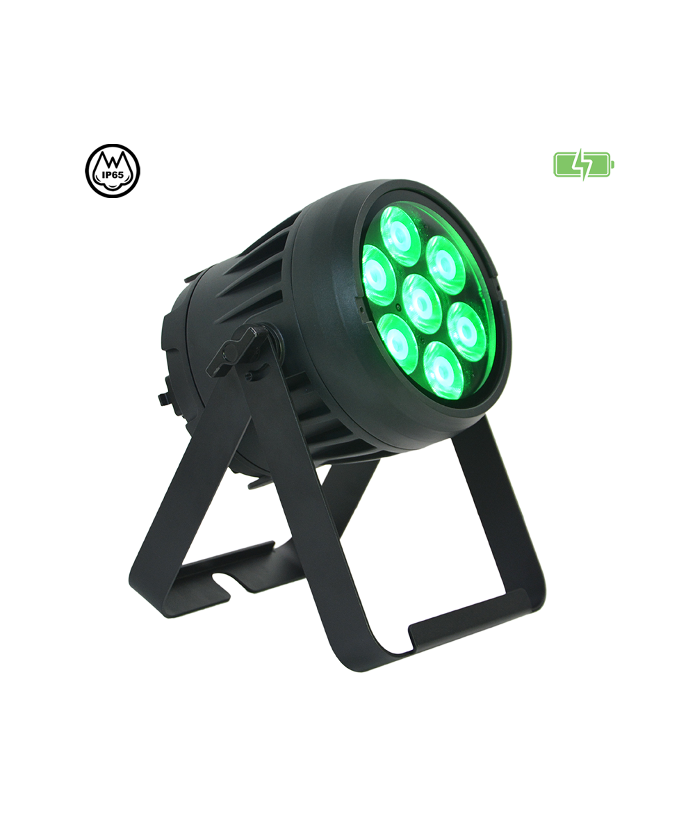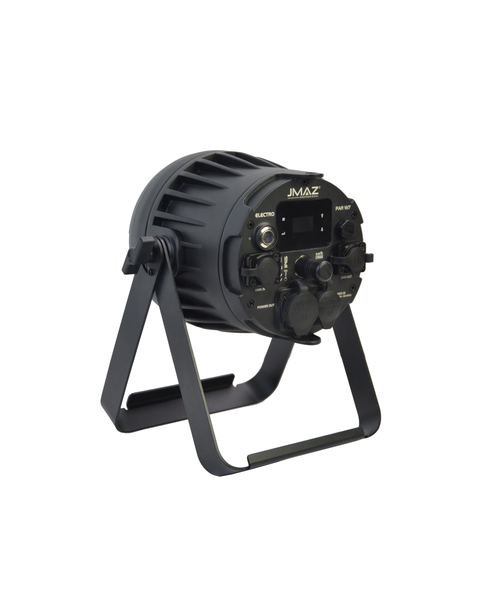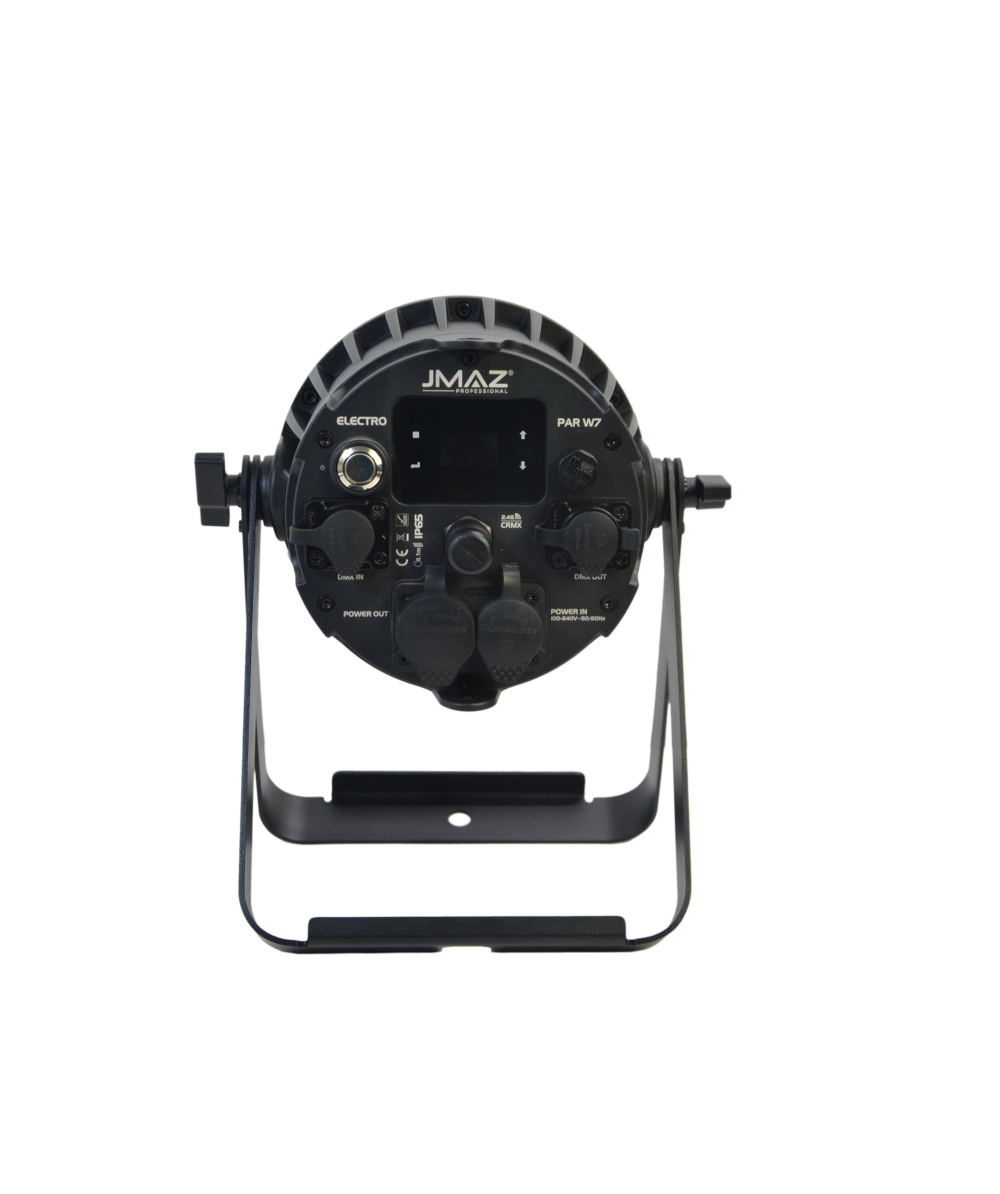 The JMAZ Professional Electro W7 is a compact and powerful RGB+LIME LED battery-powered par, engineered for outdoor environments and professional lighting applications. Outfitted with 7 high-output 12W RGB+LIME LEDs, it offers bold color rendering and a tunable CCT range of 2300K to 8500K. With an IP65 rating, the W7 is built to perform in harsh weather conditions, while delivering up to 14 hours of continuous run time—or 40 hours in battery saver mode—with just a 4.5-hour recharge. Featuring 73 preset color programs and 72 built-in auto/fade effects, the fixture provides immediate creative flexibility. The native 10° beam angle is ideal for focused uplighting, and the included diffuser expands coverage to 20°. Control options include DMX512, Wireless DMX (CRMX by LumenRadio), RDM, and IR remote, with 7 personality modes (HSV, HSI, 3–16 channels) for various programming needs. The TRUE1 IN/OUT system enables simultaneous charging and operation through the integrated battery charger, and IP65-rated 5-pin DMX ports ensure reliable data transmission. Accessories include a diffuser, TRUE1 power cable, IR remote, quick start guide, and manual. CE, FCC, RoHS certified with a UL listed battery for ultimate safety.