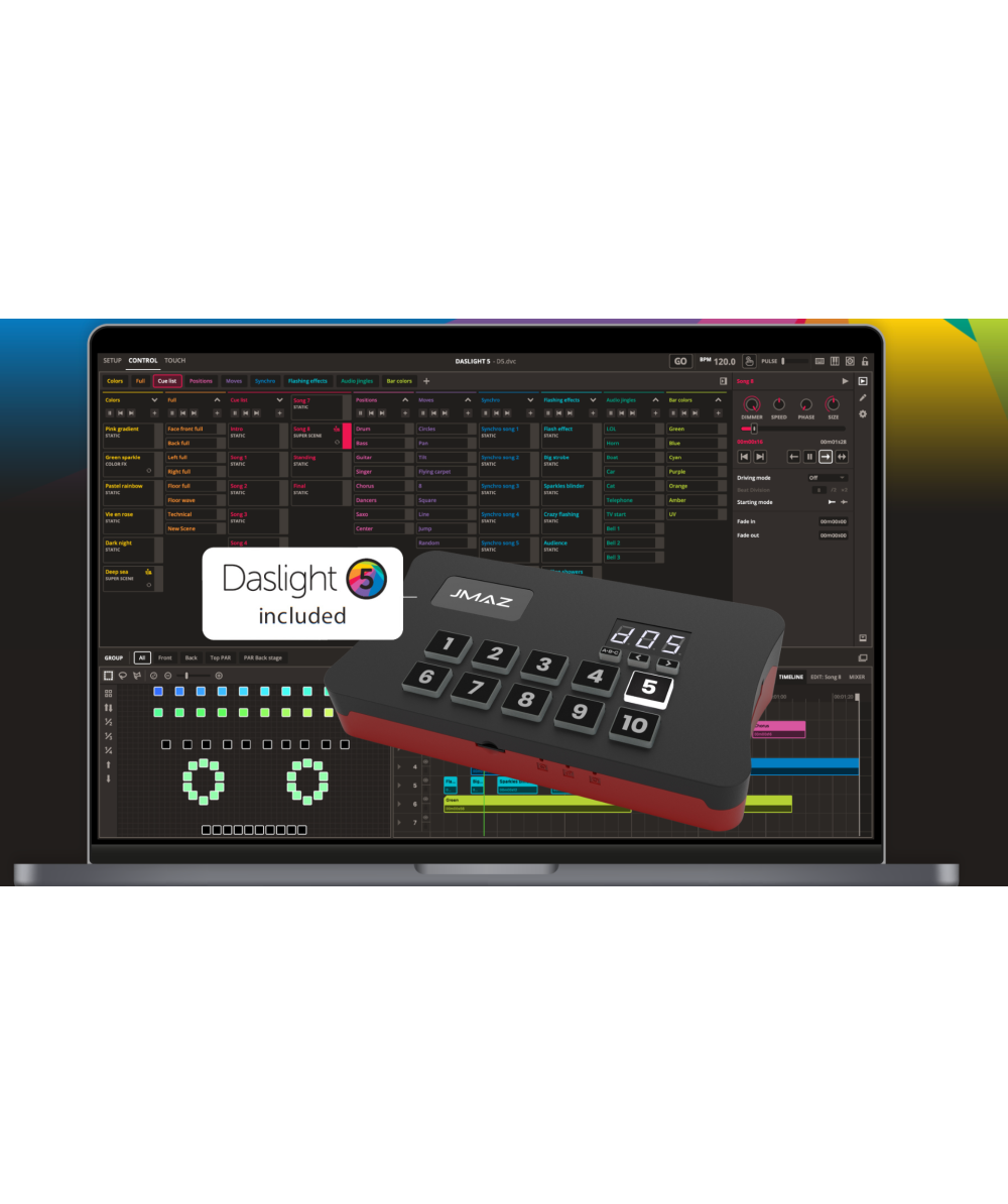 - DMX Lighting Control Unit w/Software for Mac & PC- 1 Live DMX Universe (Upgradeable), 1 Stand Alone DMX Universe (Upgradeable)- Compatible w/ ArtNet (license required)- MIDI And OSC Compatible- Built In 2D Fixture Arrangement w/ Spreading & Alignment Tools- 3D Visualizer Software- 10 Button Scene Trigger For Live Scenes or Stand Alone- 99 Scenes Stand Alone Mode- 7 Live FX Engines (Color, Chaser, Move, Value, Curve, and Color Mapping)- 20000+ Available Fixtures Profiles- BPM Control w/ Ableton Link, MIDI Clock, Audio Detection, Tap Tempo, or Manual Selection- Auto Detection Software Updates- Remote Mobile/Tablet App Allows Control of Daslight 5 Touch Screen Over Network- Protocols: 4 x 3-Pin DMX Outs- Ethernet Integration- Unlimited Time Code Super Scenes