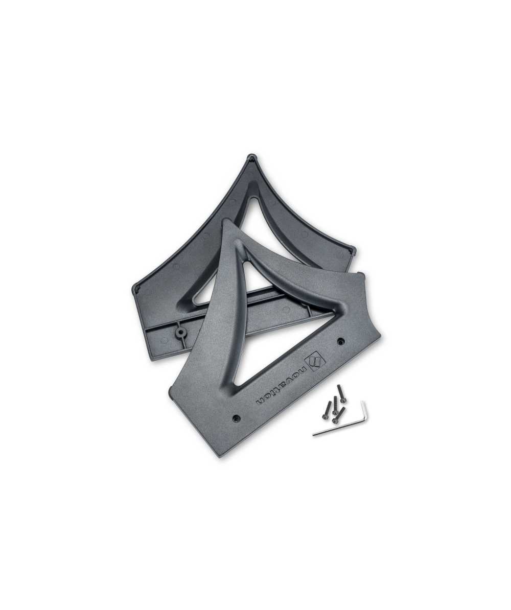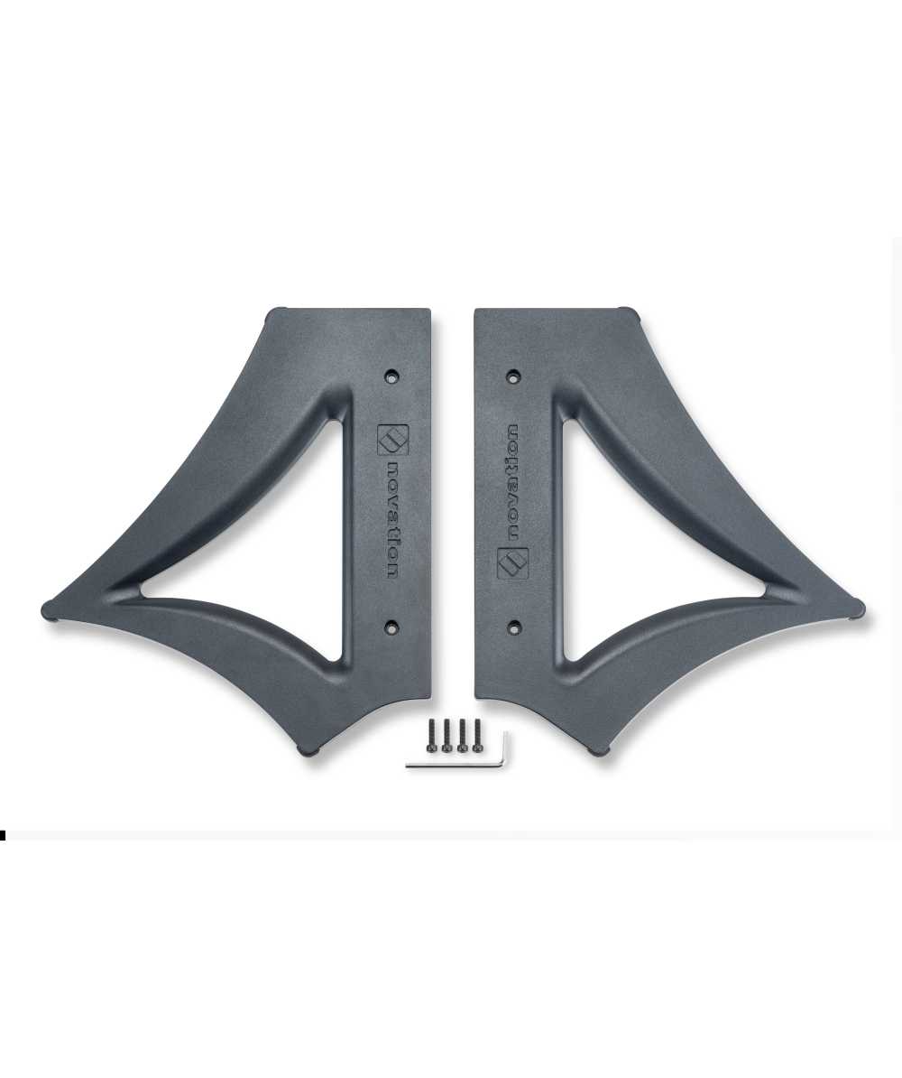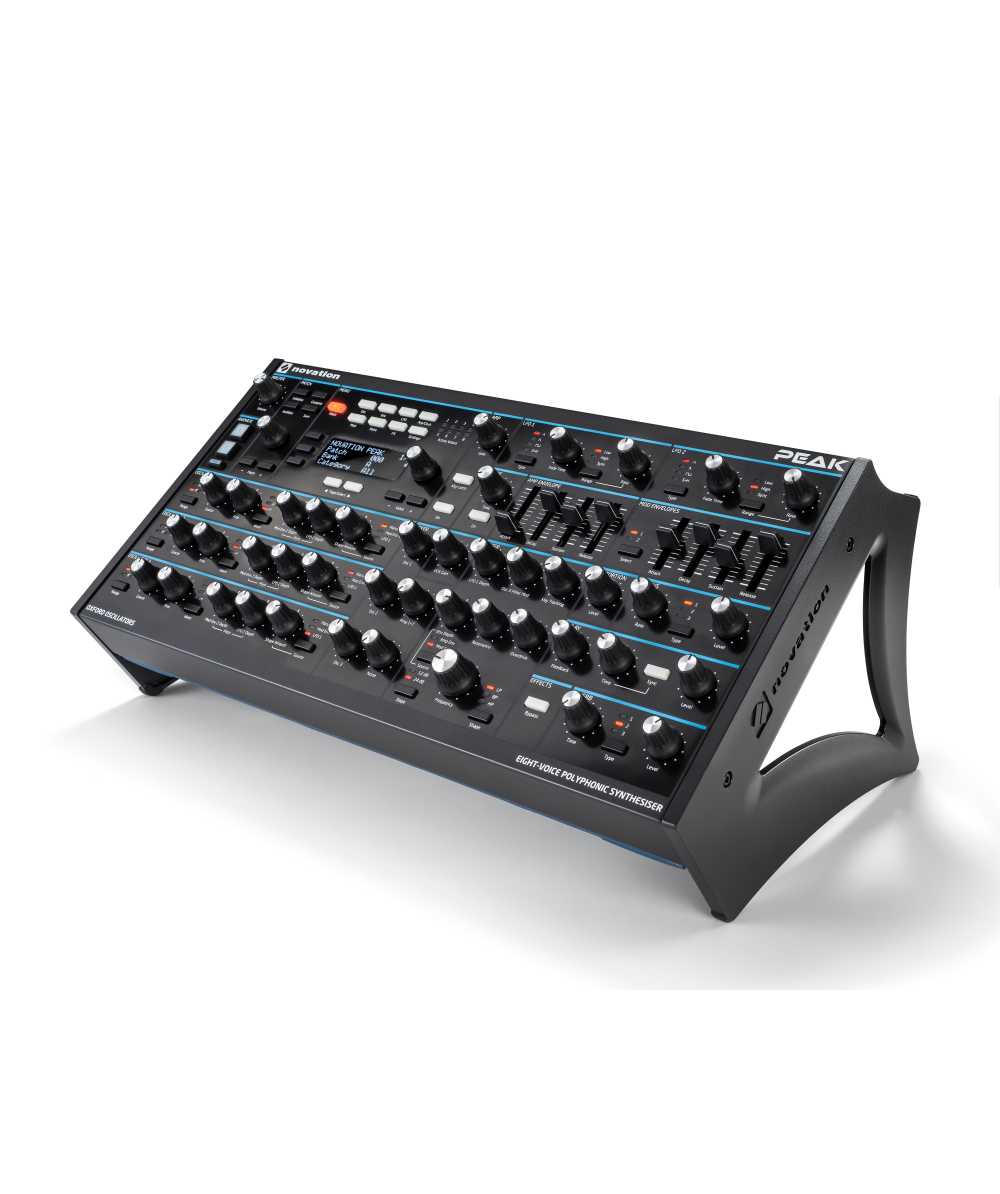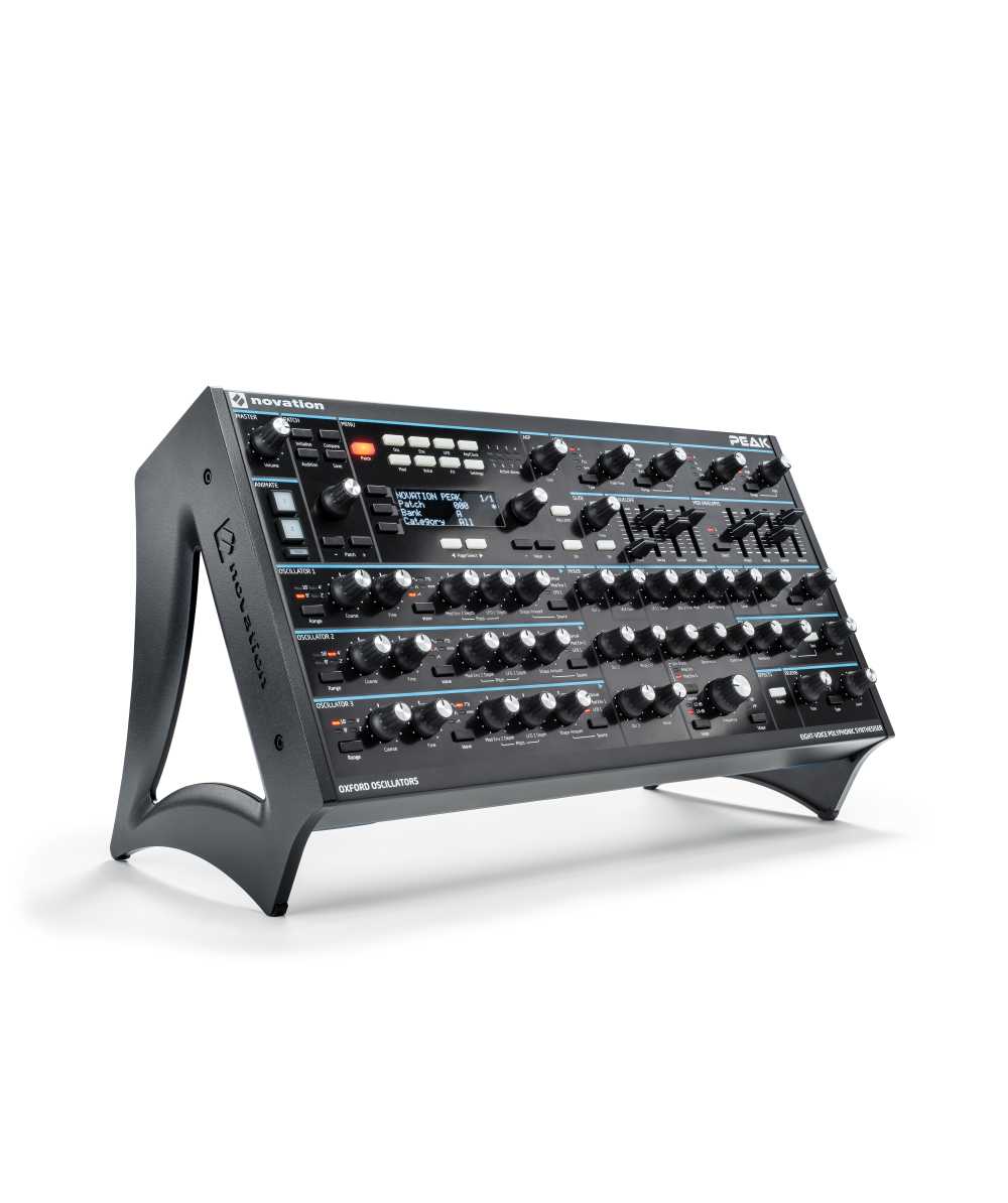 The Peak Stand lifts the Peak synth off the desk (from a choice of two angles) for better placement of controller keyboards or pad controllers. The pair of stands is made of die-cast aluminum, and there are rubber feet on all the corners that come into contact with the desk. Peak Stand ships with four hex bolts, which accompanied by the pair of stands, replace the wooden ends supplied with the Peak synth.
