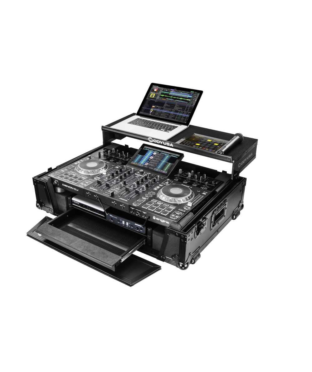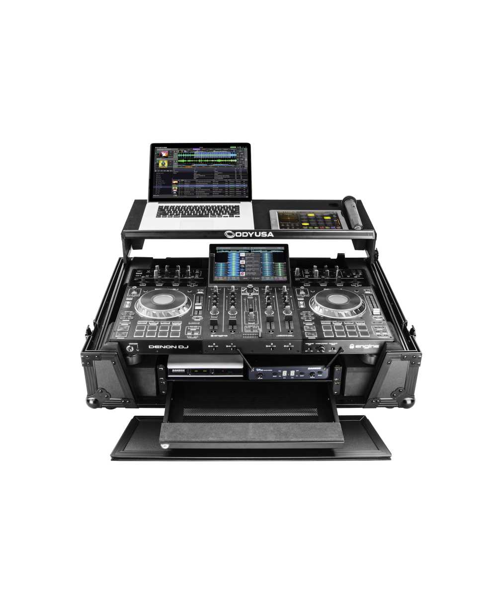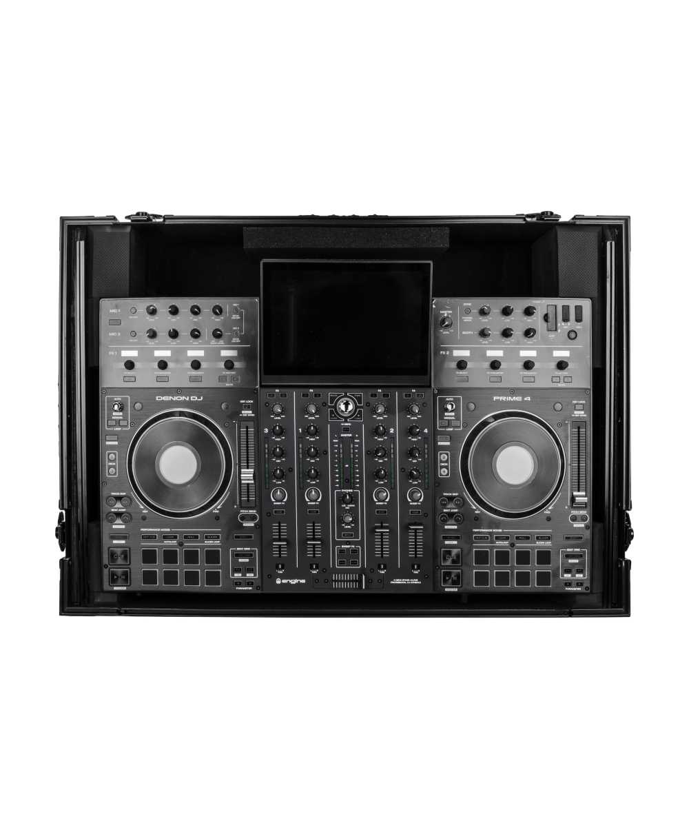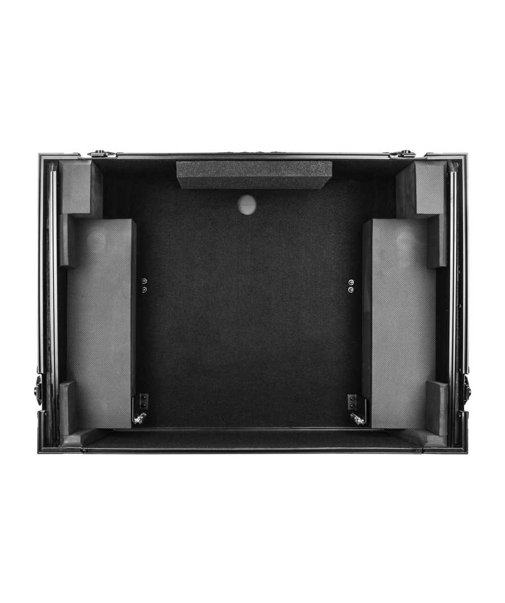 The Odyssey FZGSPRIME4W2BL Black Label case includes a removable V-cut front panel allowing access to the all of the DJ controller's front knob controls and input jack ports. It features our patented Glide Style platform perfect for positioning your laptop, tablet, effect processors, and other gear right where you want it over the Prime 4 controller. A cable management port, essential for a clean setup, is positioned below the rear of the player. Also Underneath the controller compartment is another one of Odyssey's signature digital controller case designs; a 2U 19" rack mount space below the controller space perfect for rack mount gear such as wireless mic systems, power strip, drive rack, or storage drawer. The mounting hardware included allows for front or rear rack mounting and can be removed all together if needed.