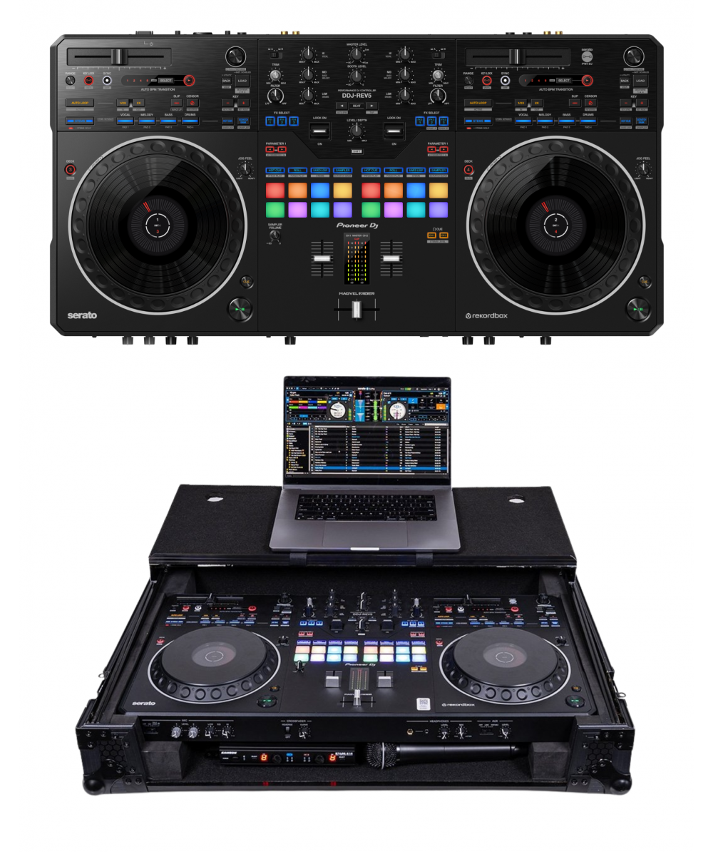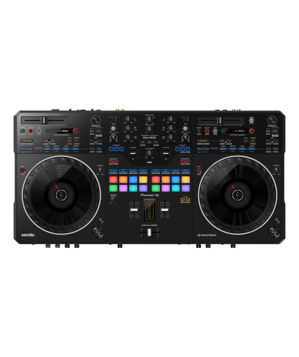 The DDJ-REV5 is a new-generation controller with Serato DJ Pro and rekordbox compatibility. This 2-channel unit offers an authentic scratch experience and innovative features including its large jogs, MAGVEL FADER, dedicated buttons for Stems control, the first-ever Auto BPM Transition, and Piano Play mode.