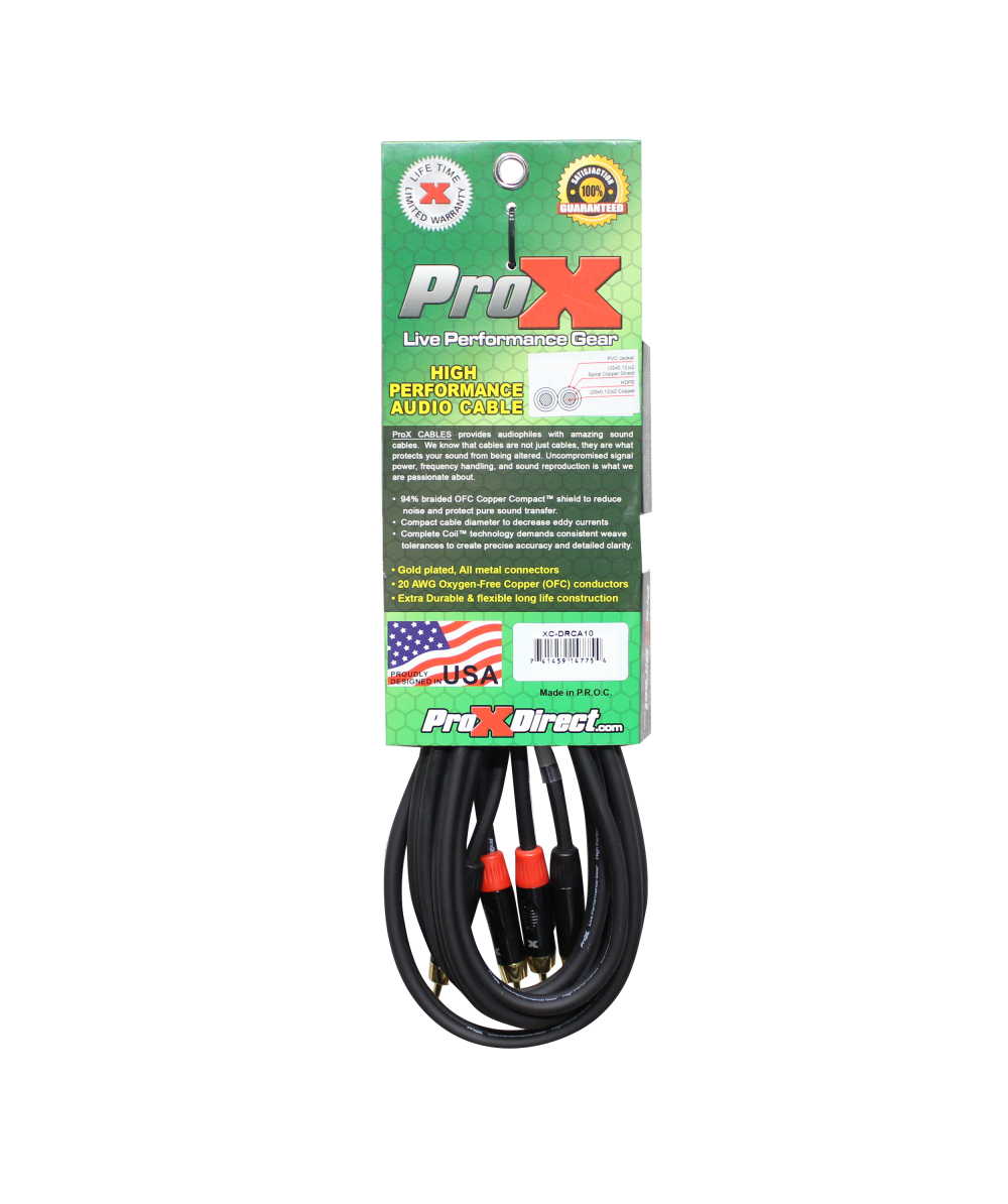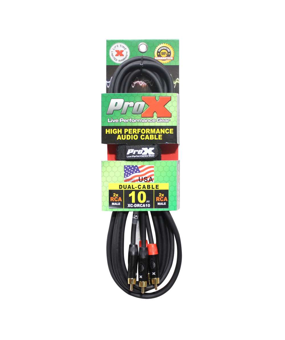ProX XC-DRCA10 10' Ft. High-Performance Dual RCA Male to Dual RCA Male Stereo Balanced Audio Cable. ProX Live Performance Gear Cables are made to last you an entire lifetime. Each cable is made with high-quality materials and delivers a clear signal and connection each time. These cables are made by professionals for professionals like you. Each cable is built for High Performance and to withstand heavy everyday use.