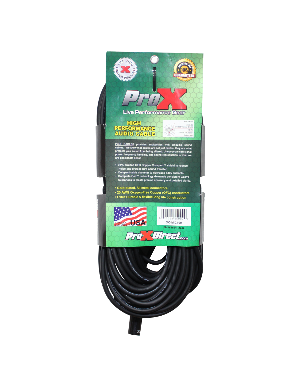 ProX XC-MIC100 100 Ft. Balanced XLR-F to XLR-M High-Performance Microphone Cable. ProX Live Performance Gear Cables are made to last you an entire lifetime. Each cable is made with high-quality materials and delivers a clear signal and connection each time. These cables are made by professionals for professionals like you. Each cable is built for High Performance and to withstand heavy everyday use.