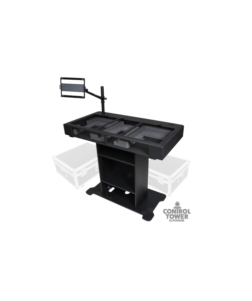 Out of the box, assembly takes minutes with no tools required. The base plate clamps to the center shaft together with the steel butterfly latch locks. Once the center column and shelves are installed, mount the top control deck to the top of the column, and then secure it with the latches. Included in the box are 3 custom foam inserts and top frames to use with your desired DJ controller. Once the controller has been placed inside, apply the frame and now you can mount your boom arm and laptop tray to the left or right position.