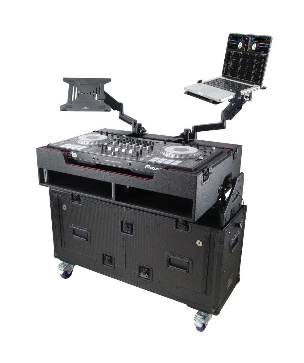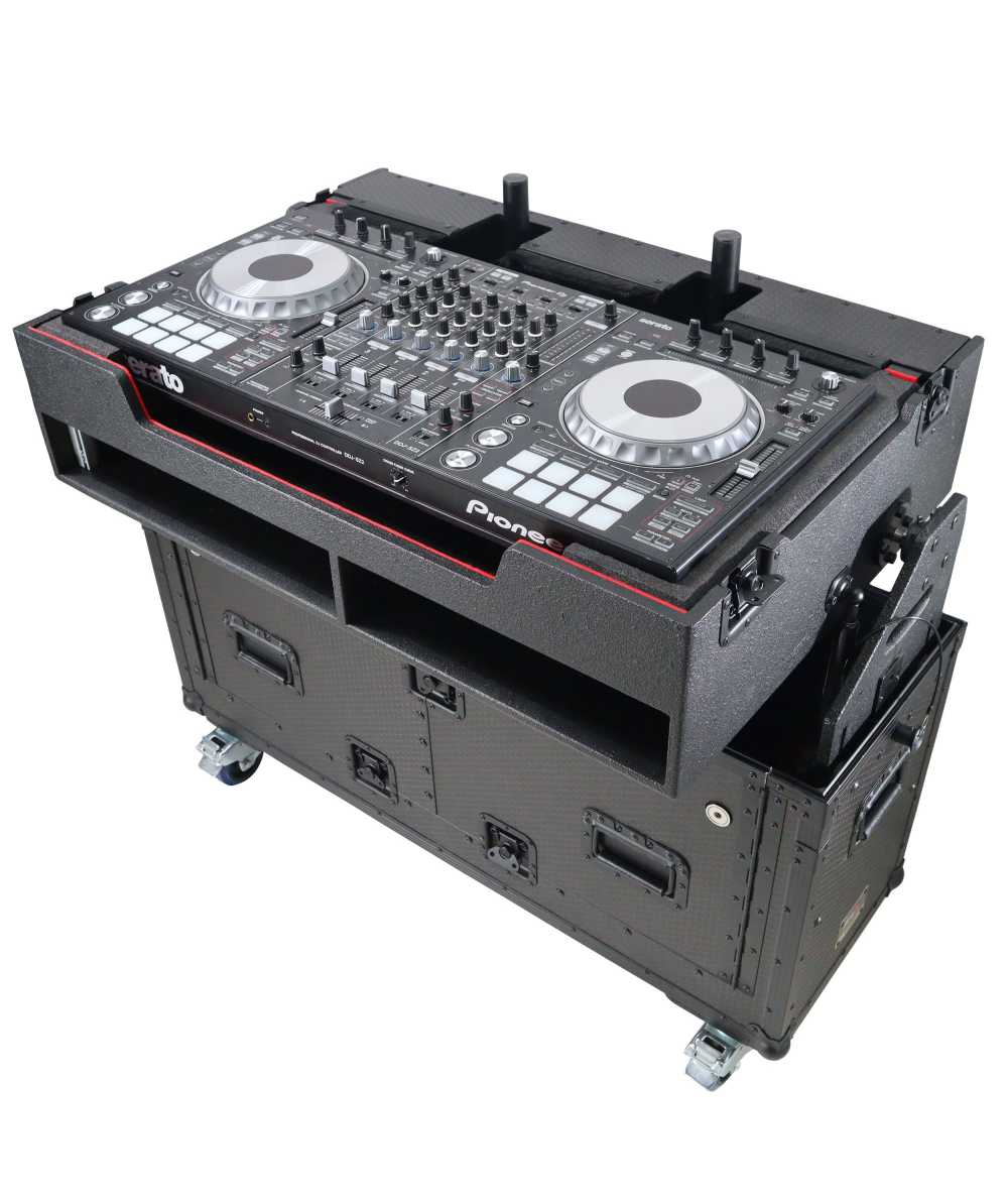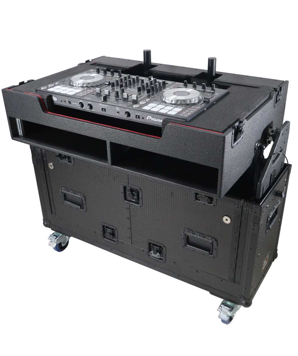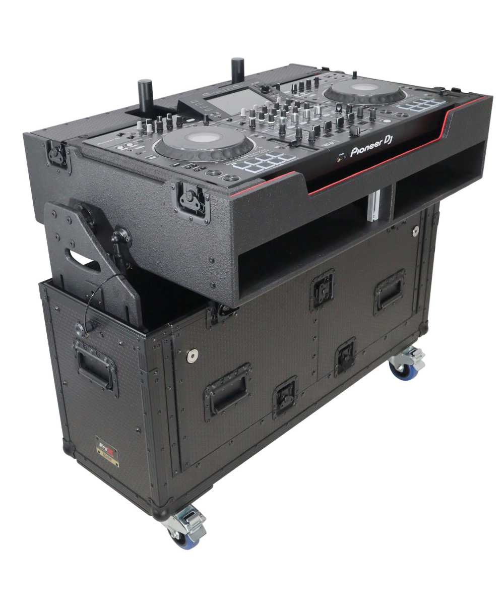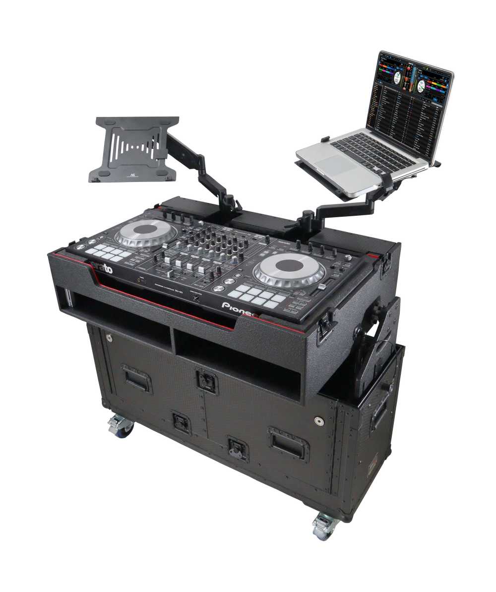 ProX XZF-UCXX Flip-Ready Hydraulic DJ Easy Lifting Flight Case For Pioneer DDJ-REV7 XDJ-XZ Opus Quad with Wheels and 2x Laptop Trays by Zcase. ProX is a distributor of ZCASE Flip-Ready Patented Hydraulic Lift Console Cases. XZF-UCXX is made for easy transport and operation of digital audio consoles and more. Typically, most console cases require two or more people to lift onto a table or stand. This live-in audio and lighting DJ Controller case is made for a single user to transport, and roll in, and requires NO MORE HEAVY LIFTING – the DJ Control Deck area can be lifted vertically with the touch of one finger!