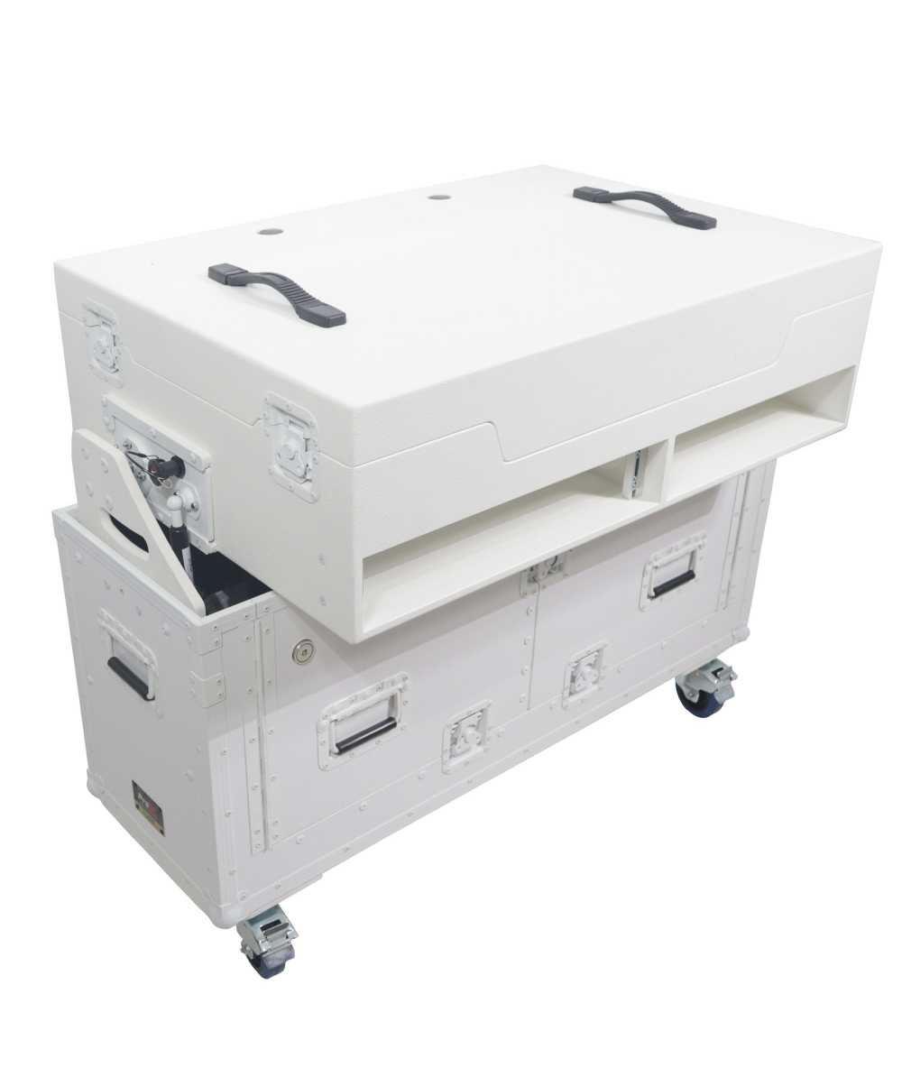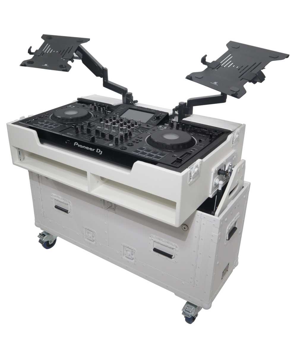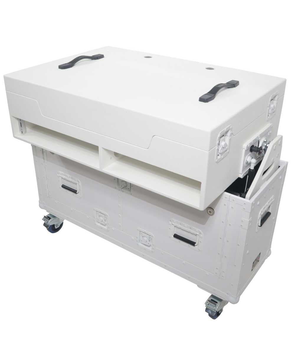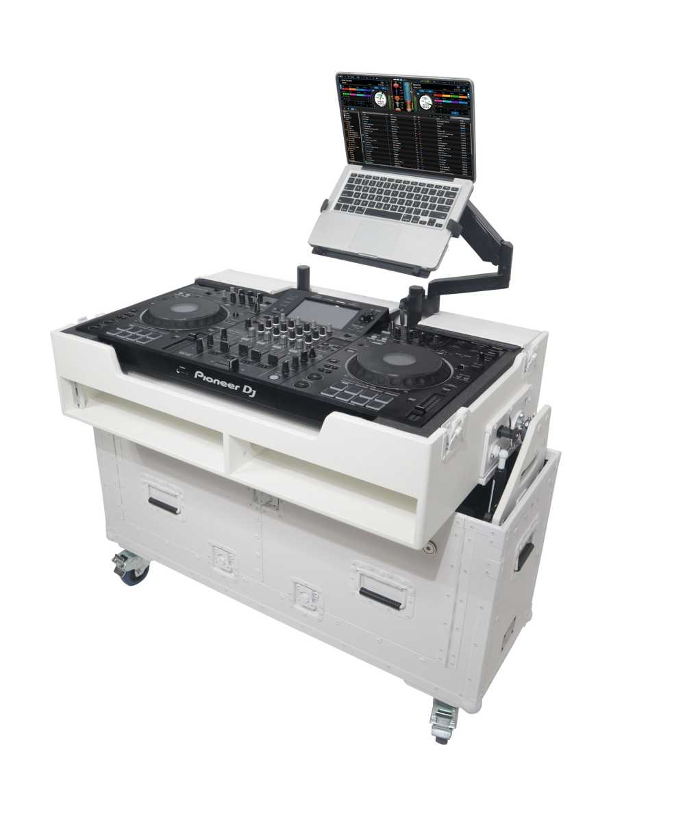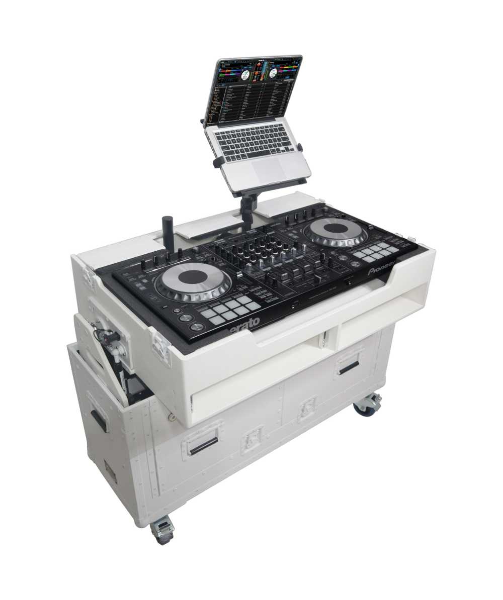 ProX XZF-UCXXWHITE Flip-Ready Hydraulic DJ Easy Lifting Flight Case For Pioneer DDJ-REV7 XDJ-XZ DDJ-1000 SZ2 SX3 with Wheels and 2x Laptop Trays by Zcase. ProX is a distributor of ZCASE Flip-Ready Patented Hydraulic Lift Console Cases. XZF-UCXX is made for easy transport and operation of digital audio consoles and more. Typically, most console cases require two or more people to lift onto a table or stand. This live-in audio and lighting DJ Controller case is made for a single user to transport, and roll in, and requires NO MORE HEAVY LIFTING – the DJ Control Deck area can be lifted vertically with the touch of one finger!