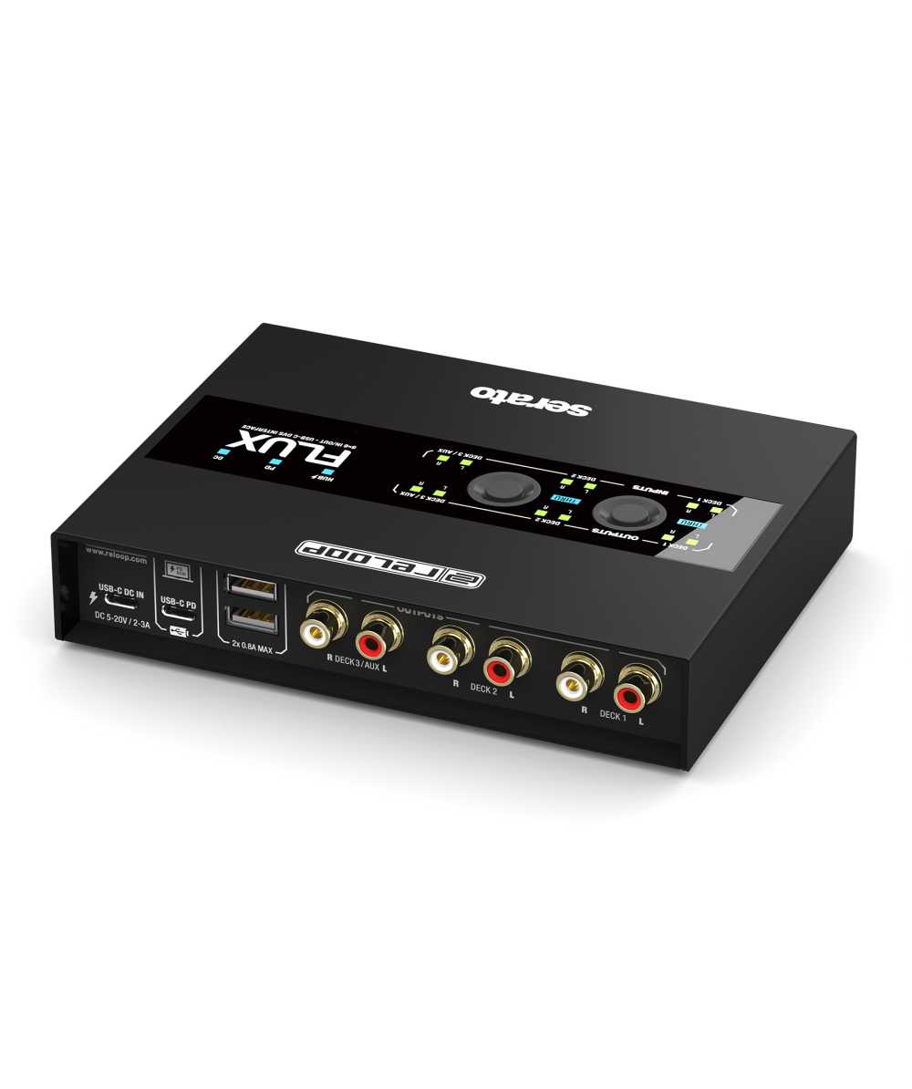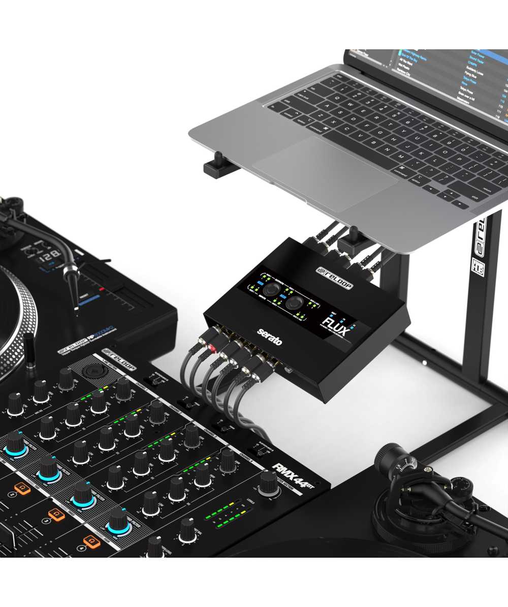 The Reloop Flux is a next-generation USB-C interface for using Serato DJ Pro with turntables, CDJs or other media players. The interface boasts superior audio qualities, a well-designed operating concept and a club-ready design. It can transform any conventional mixer into a professional digital vinyl system.